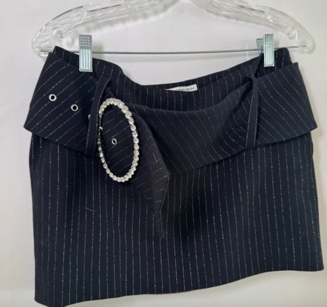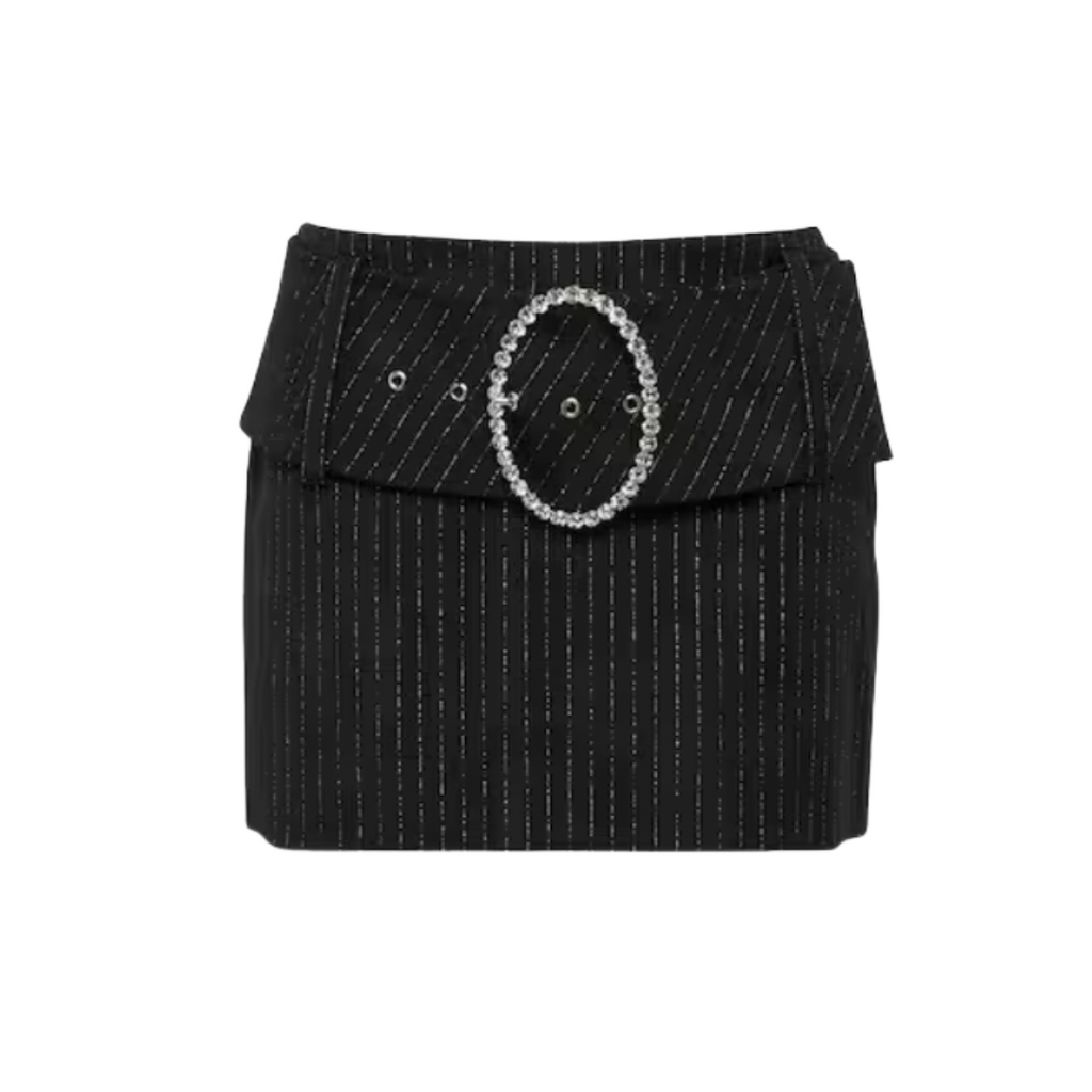 This miniskirt from Alessandra Rich is made from wool-blend Lurex® in a fitted low-rise silhouette. It features a pinstriped design and a wide belt with an oversized jeweled buckle embellishment.
