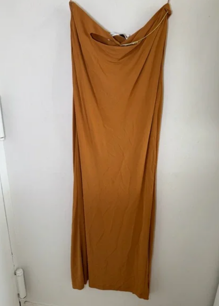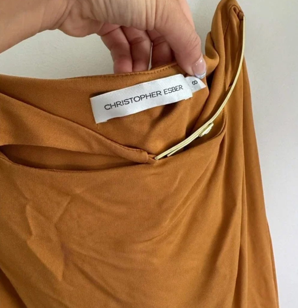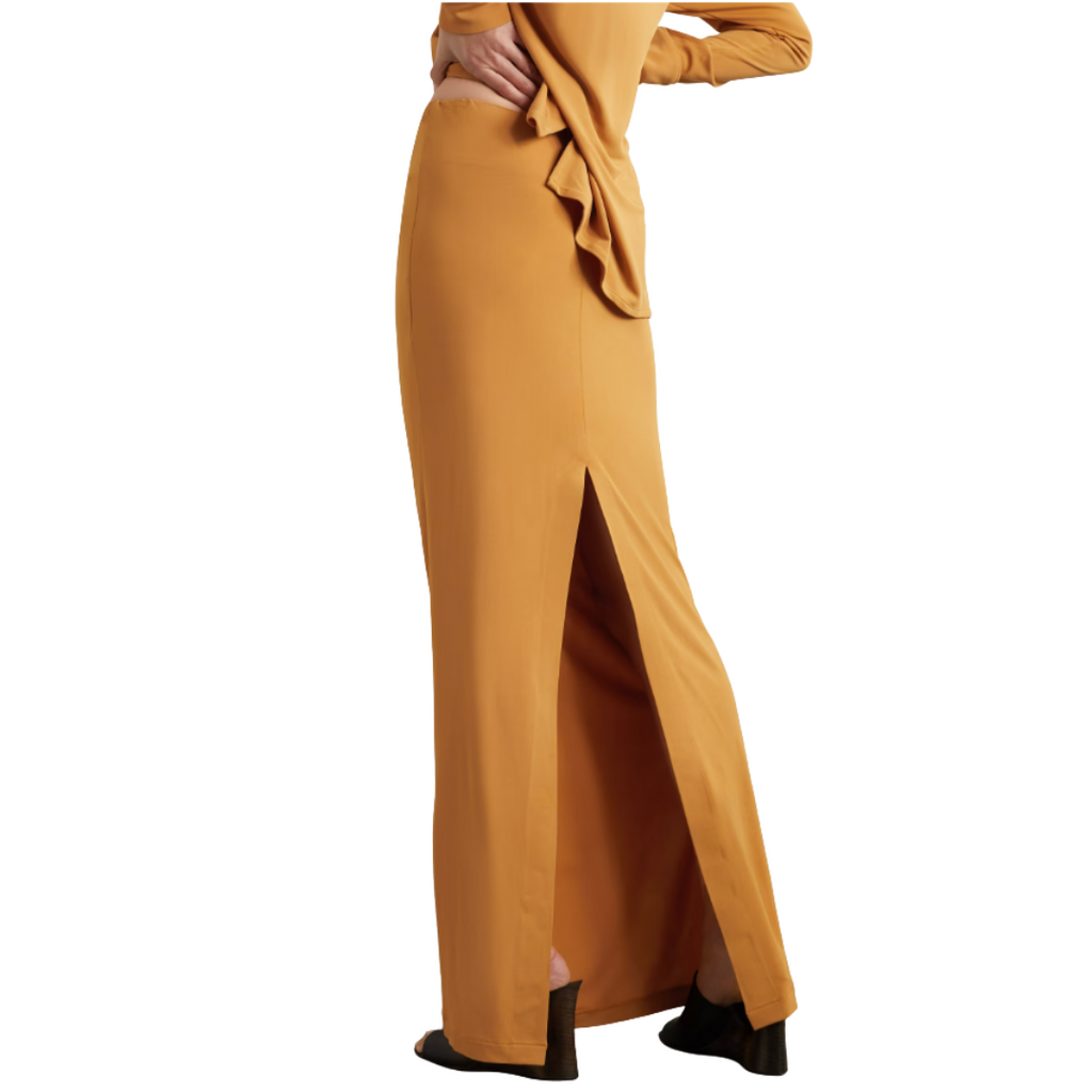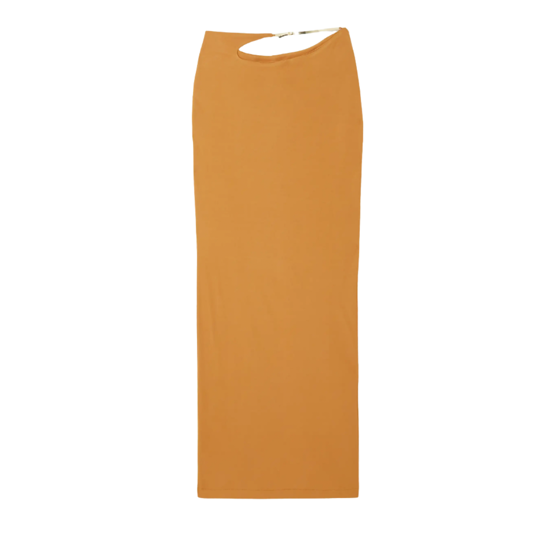 Christopher Esber's maxi skirt is made from soft jersey that skims your figure. Dyed a rich 'Caramel' shade, it has a handcrafted buckle framing the cutout waist and a deep split at the back for ease of movement. Style yours with the matching shirt and gold hoop earrings.