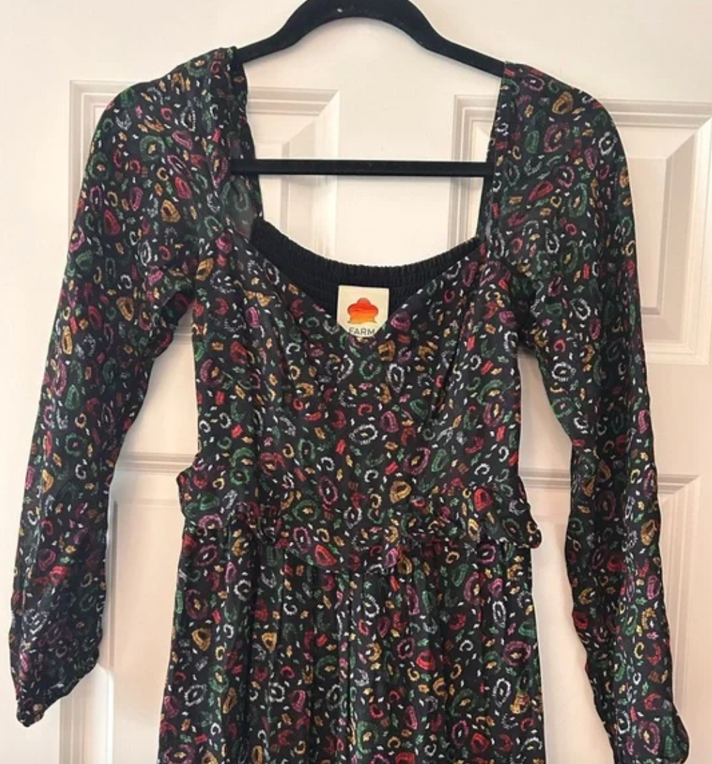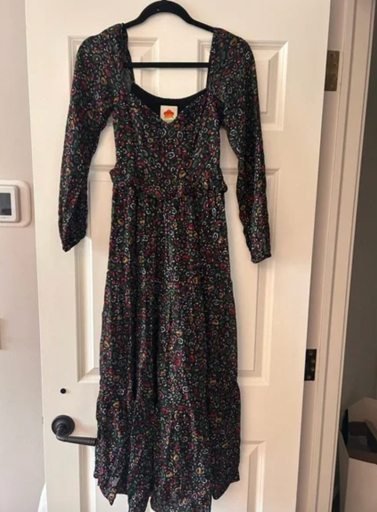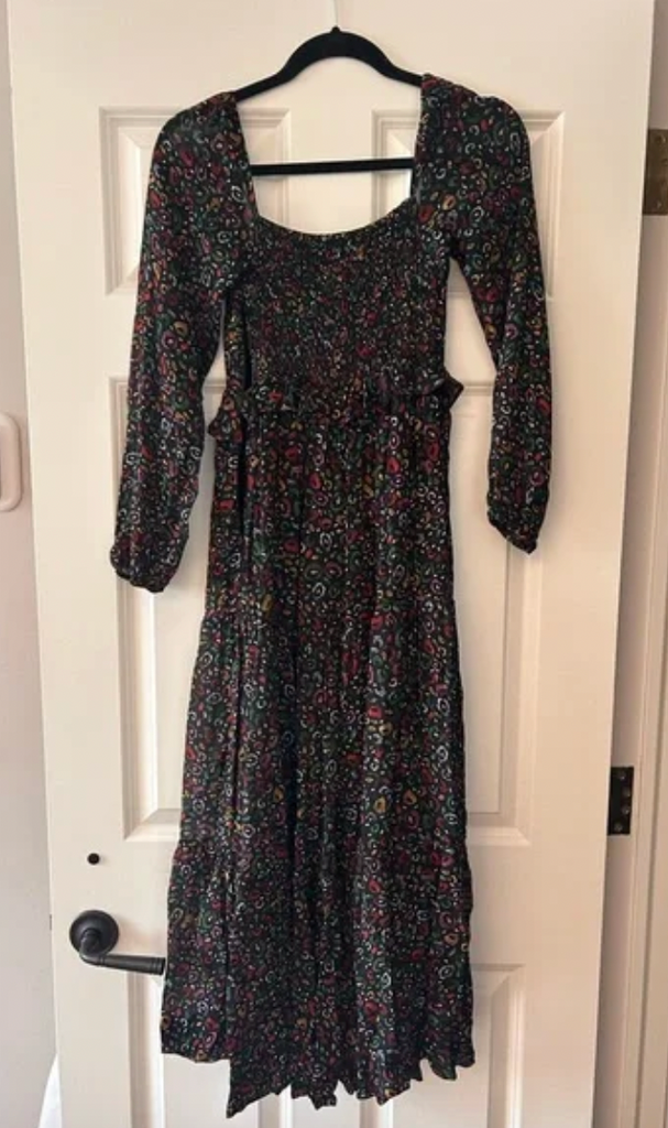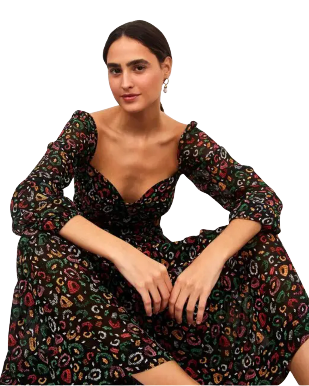 - maxi length sweetheart neckline ¾ sleeves tiered skirt ruffled detailing in the waistline and skirt