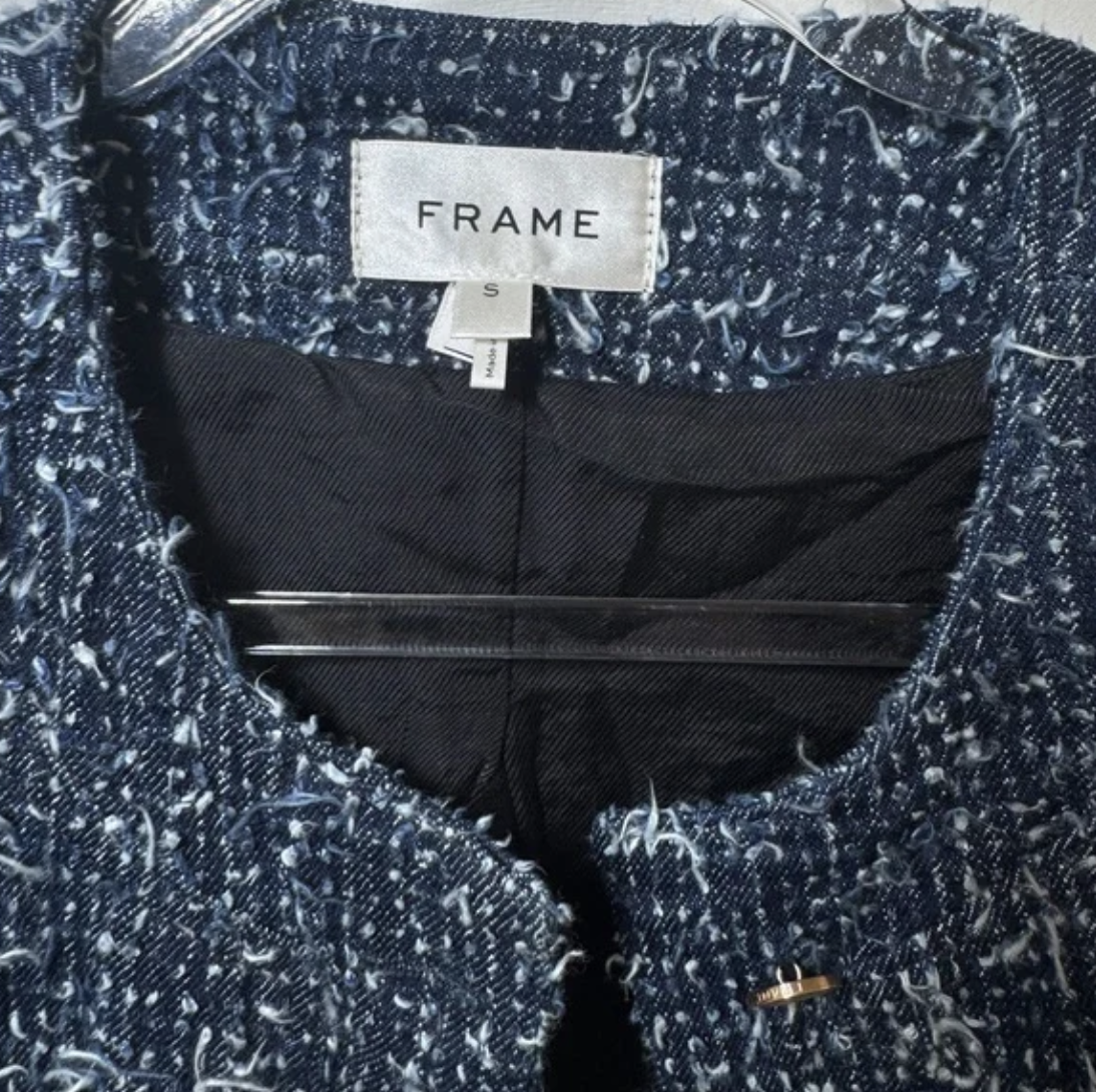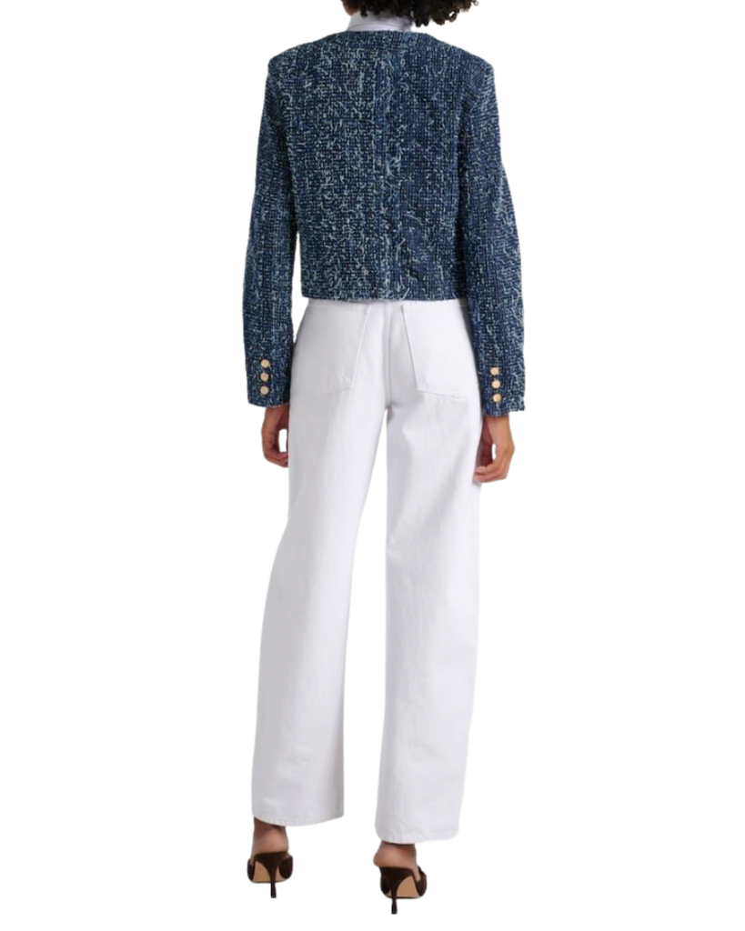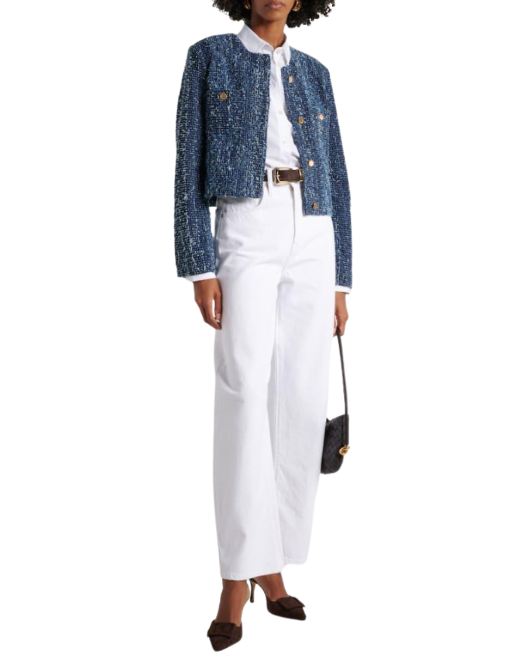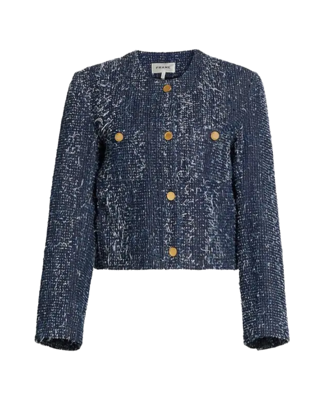 Denim bouclé brings textural appeal to a boxy, collarless jacket structured with shoulder pads and cropped to a contemporary length.