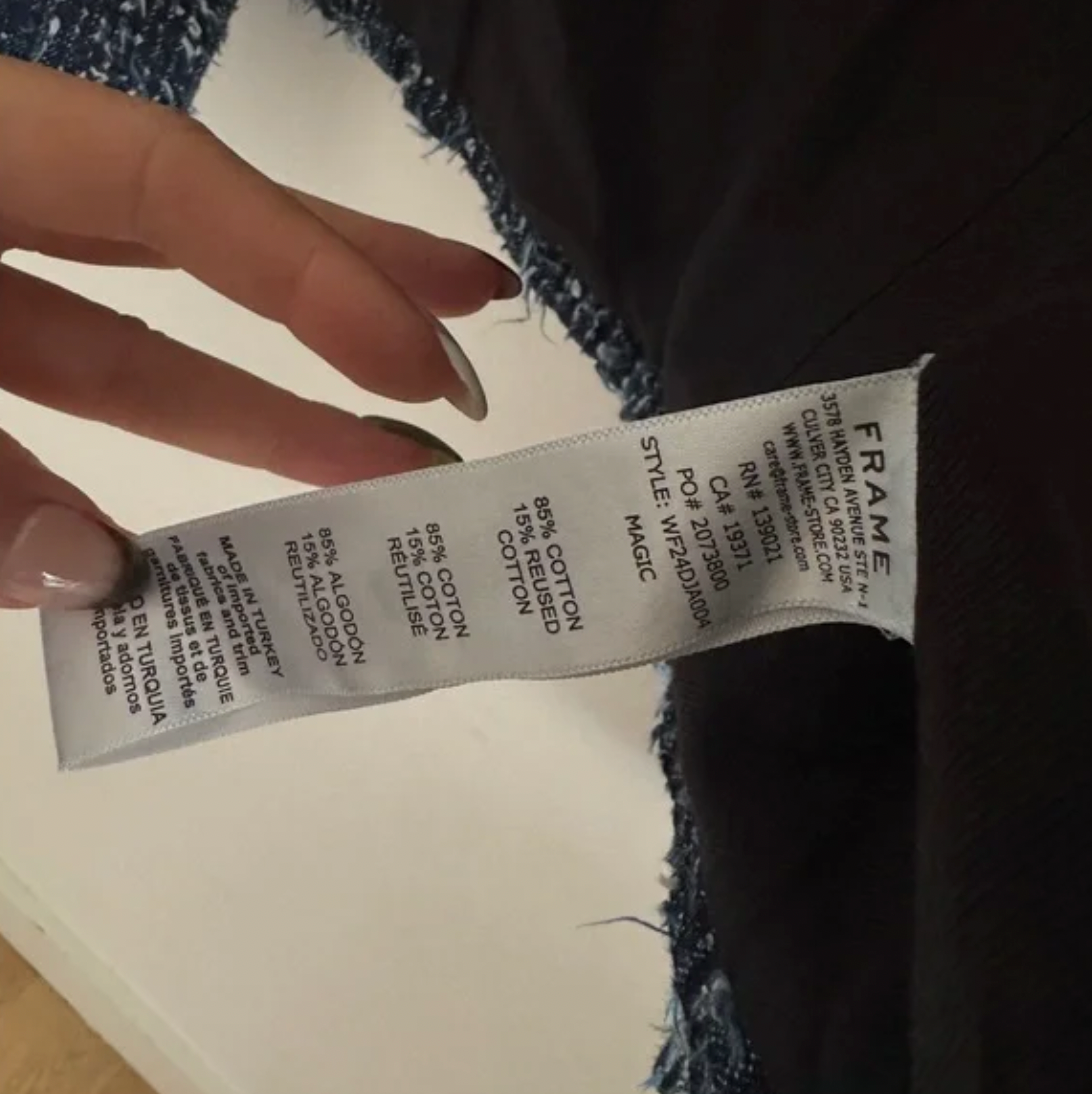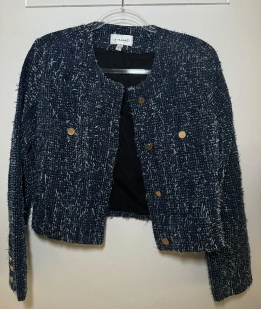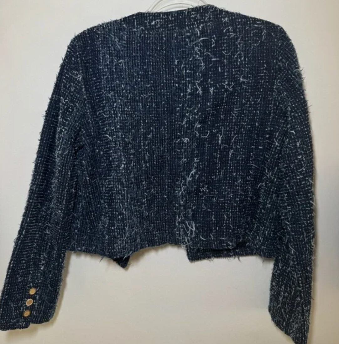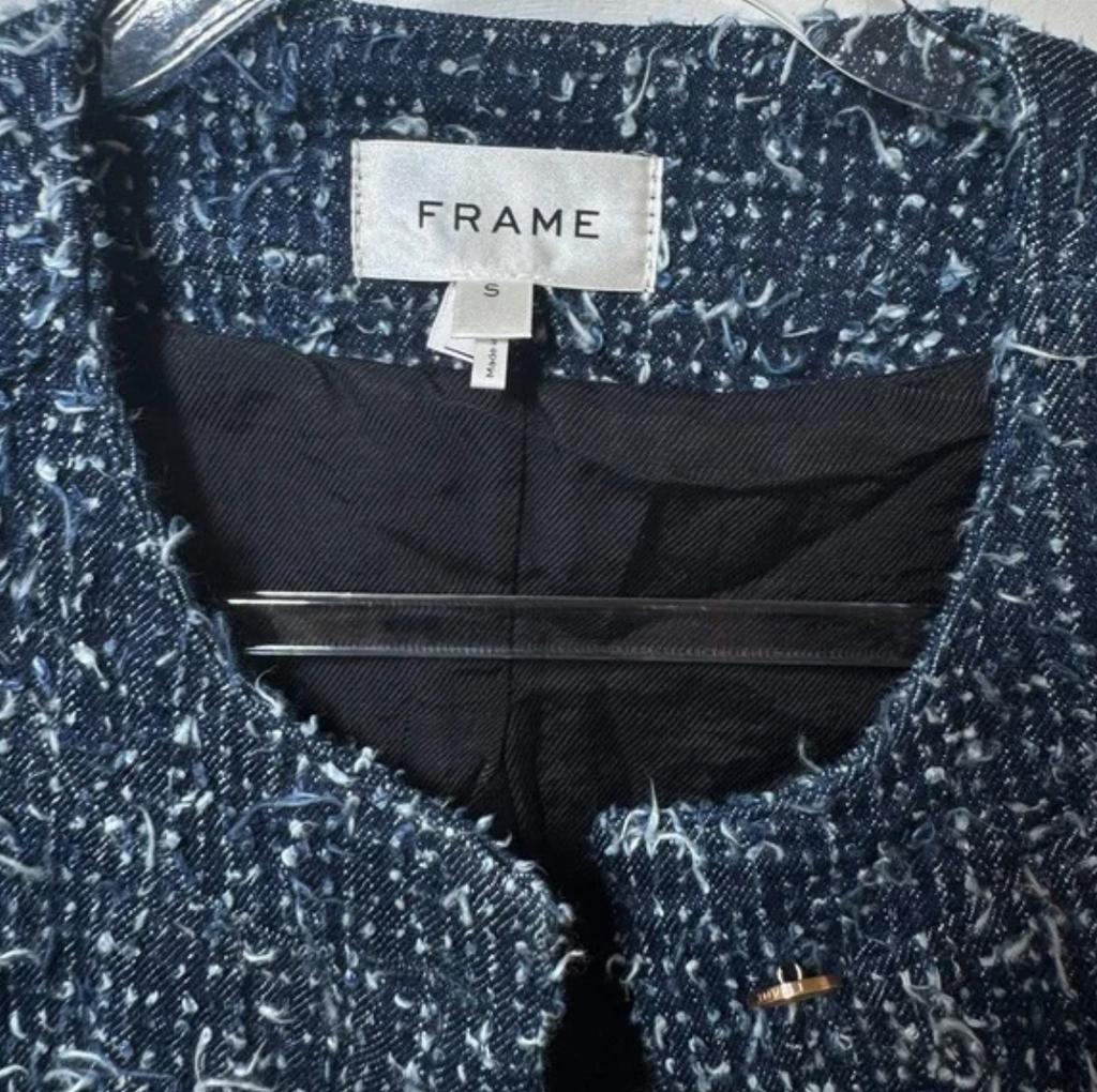 Denim bouclé brings textural appeal to a boxy, collarless jacket structured with shoulder pads and cropped to a contemporary length.