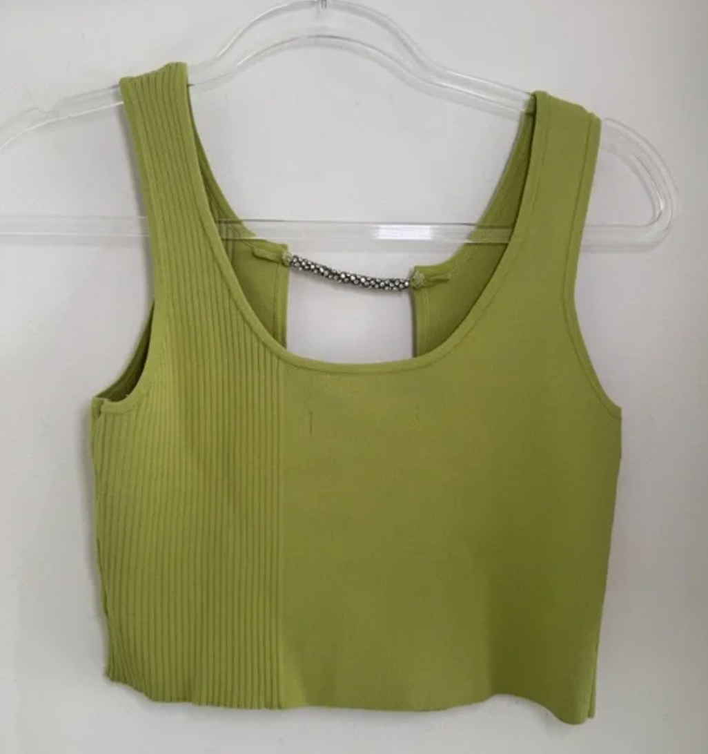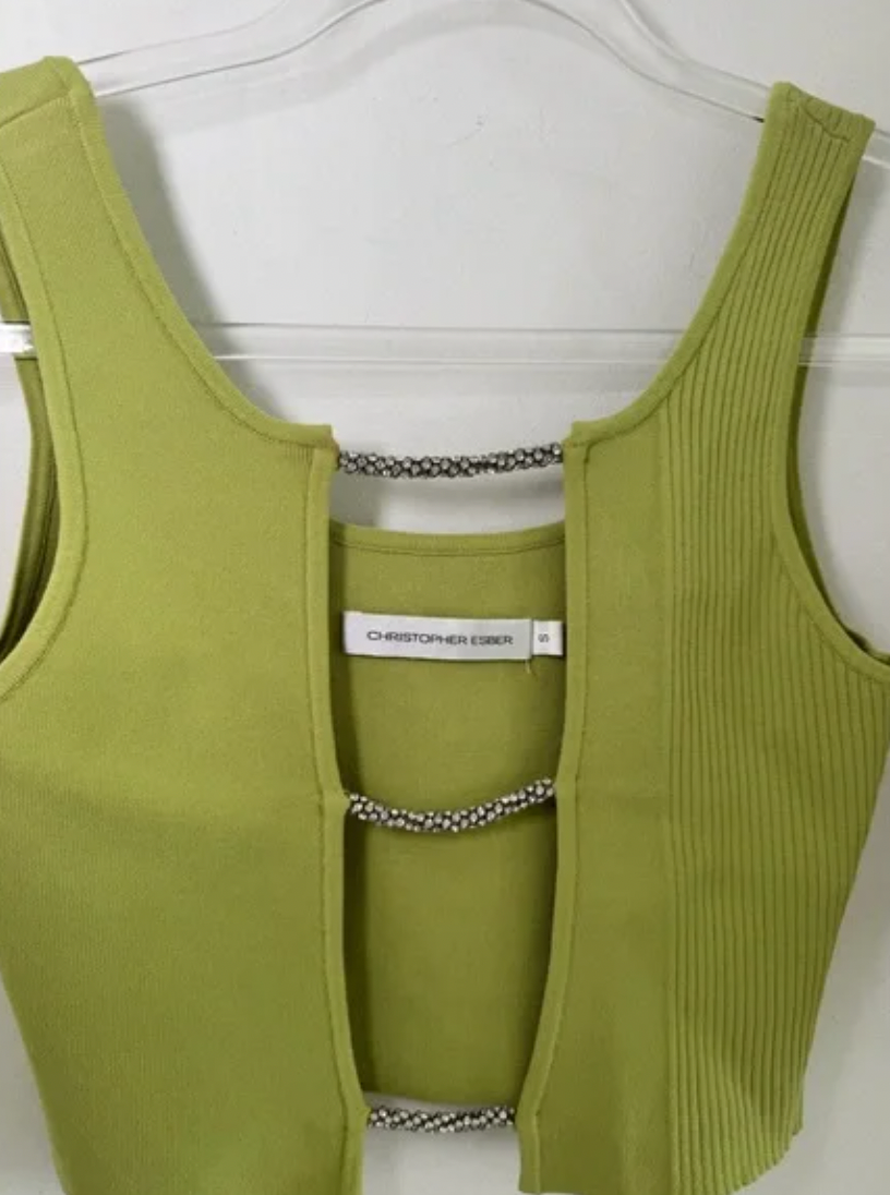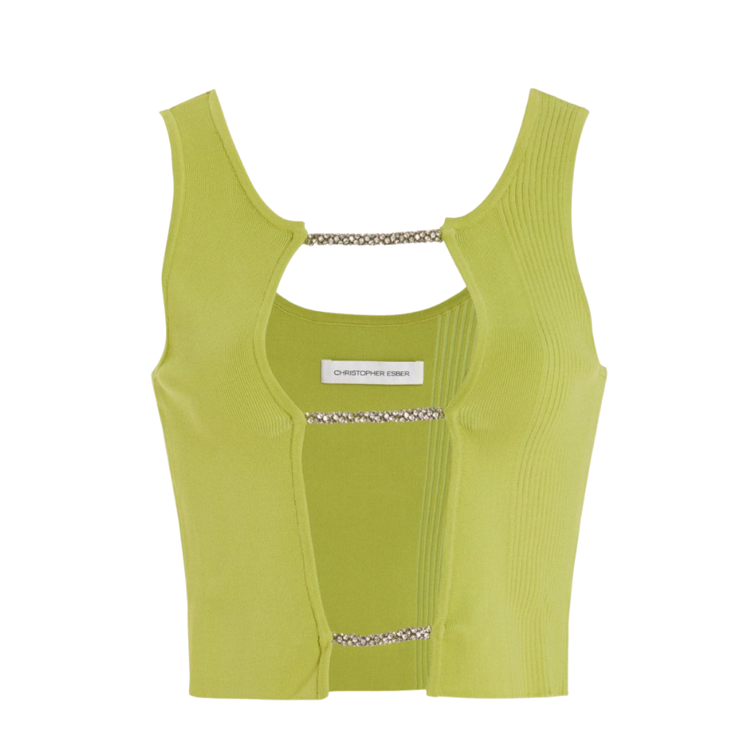 Featuring crystal lattice details across the front, this ribbed knit top is sleeveless with a slim fit. Wear yours with the matching skirt to complete the look.