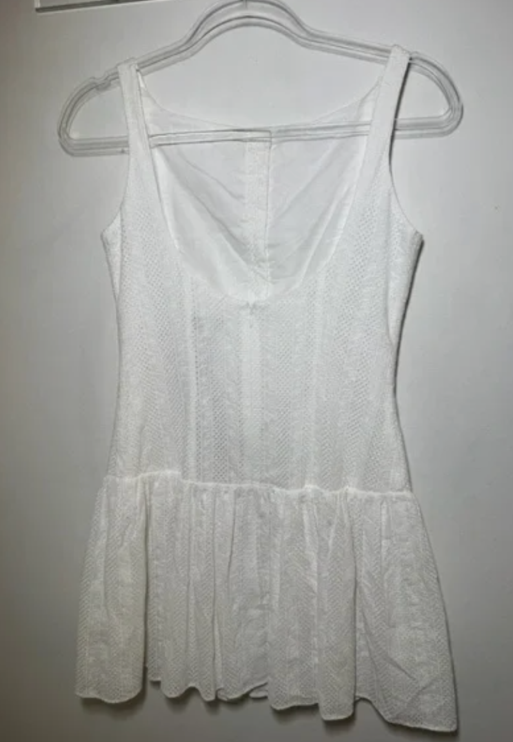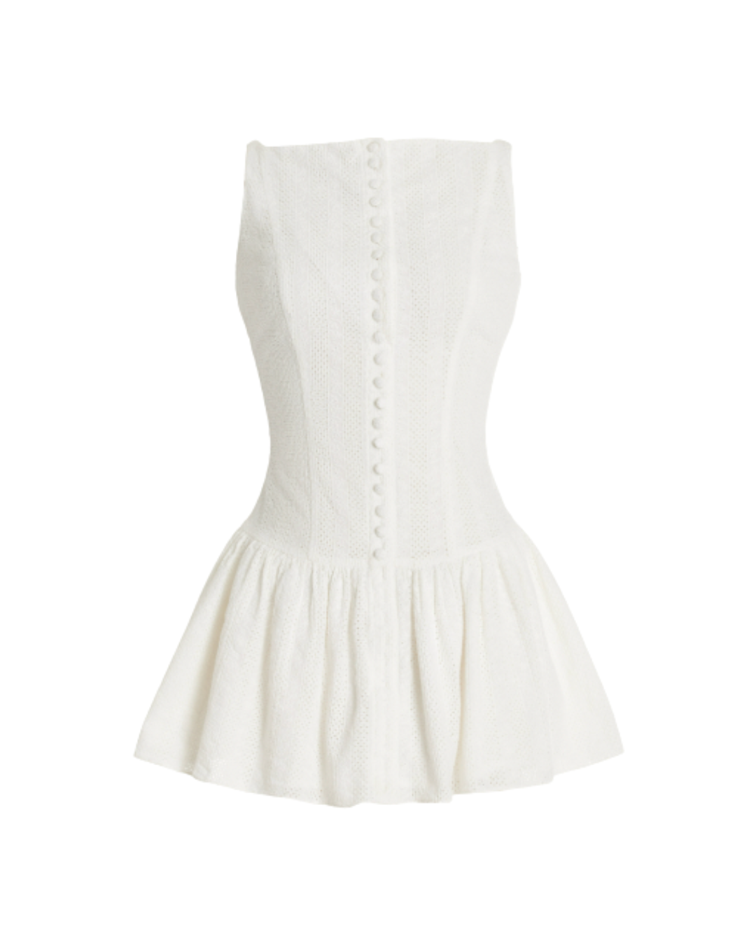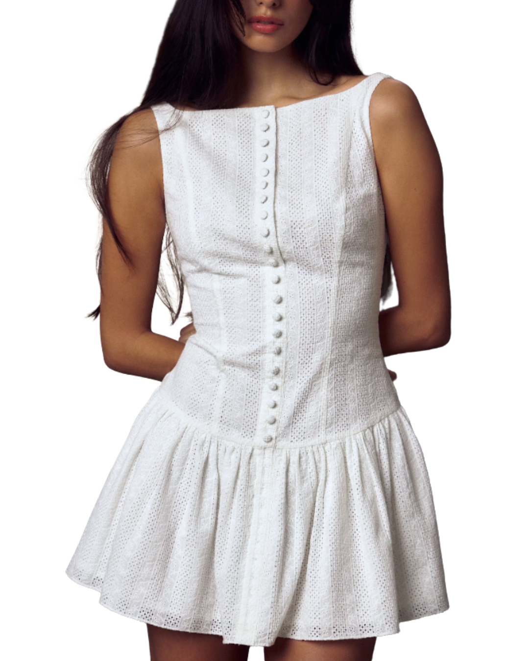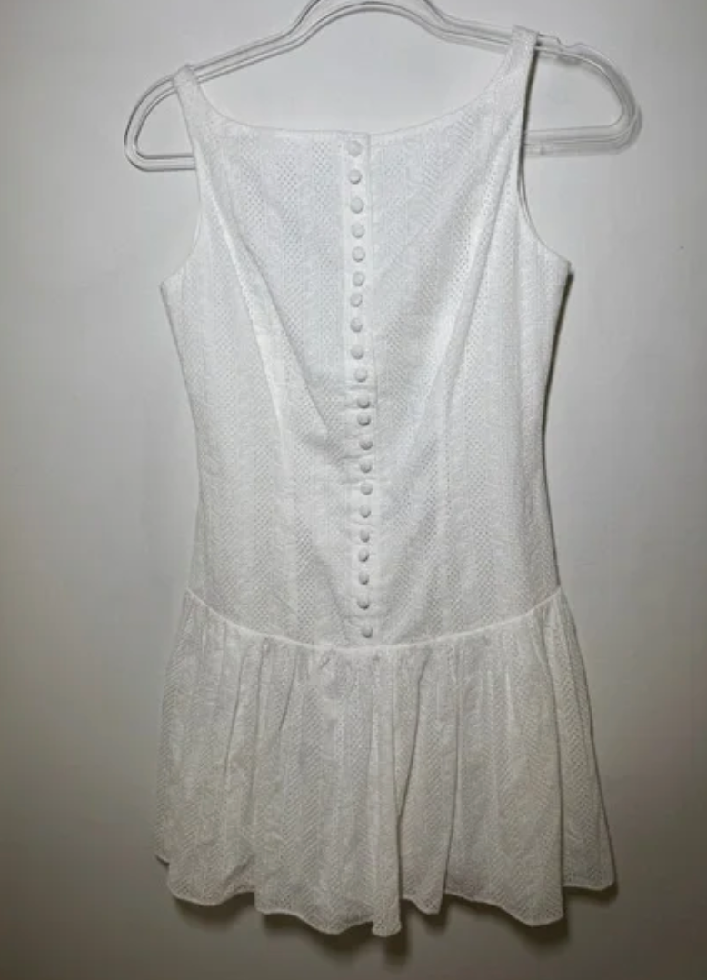 Boatneck drop-waist eyelet mini dress that has self covered, functional buttons up to the bodice, a scoop back and invisible zipper with hook and eye closure at center back.