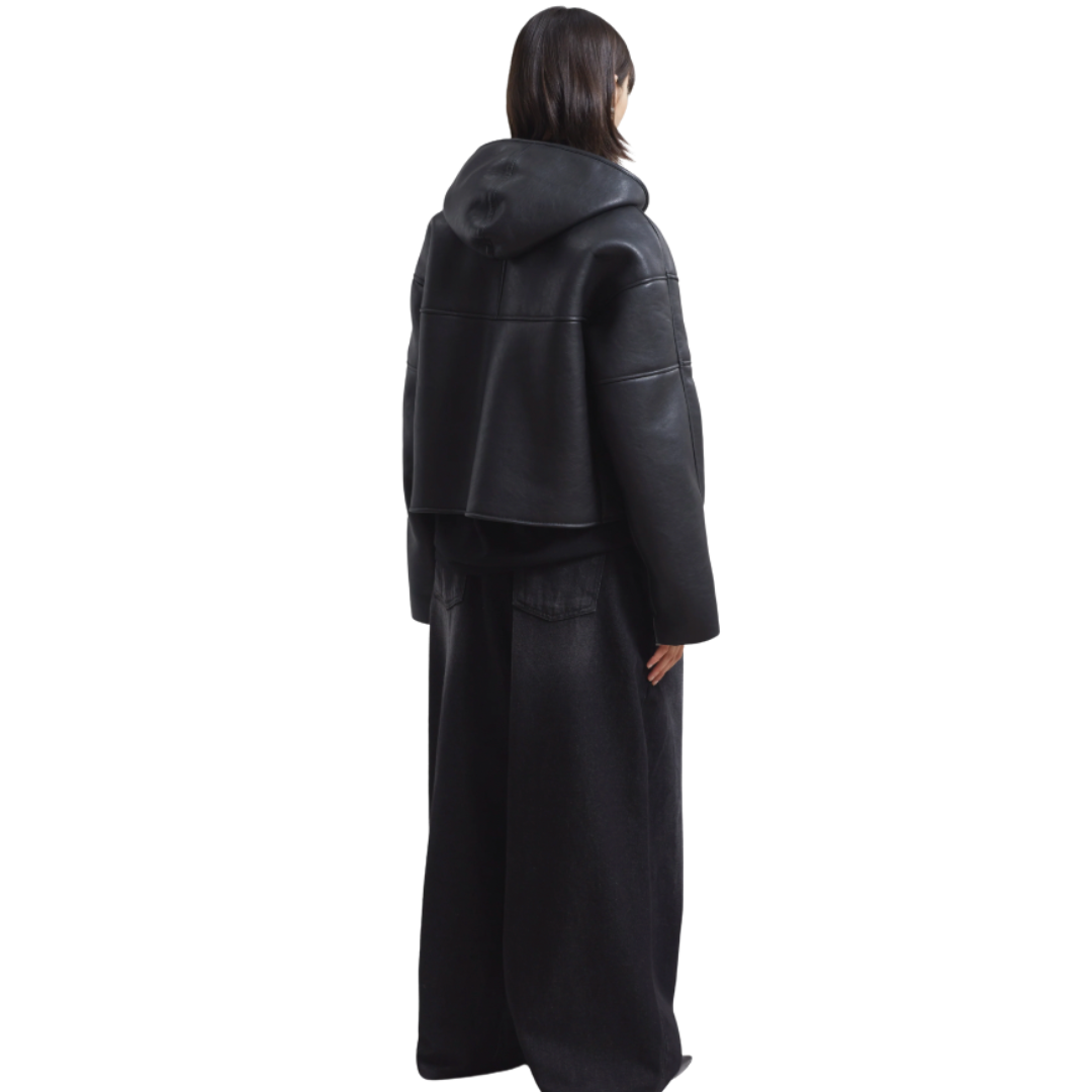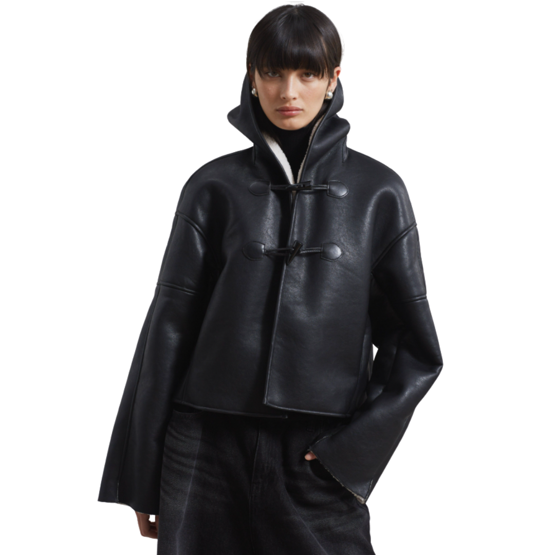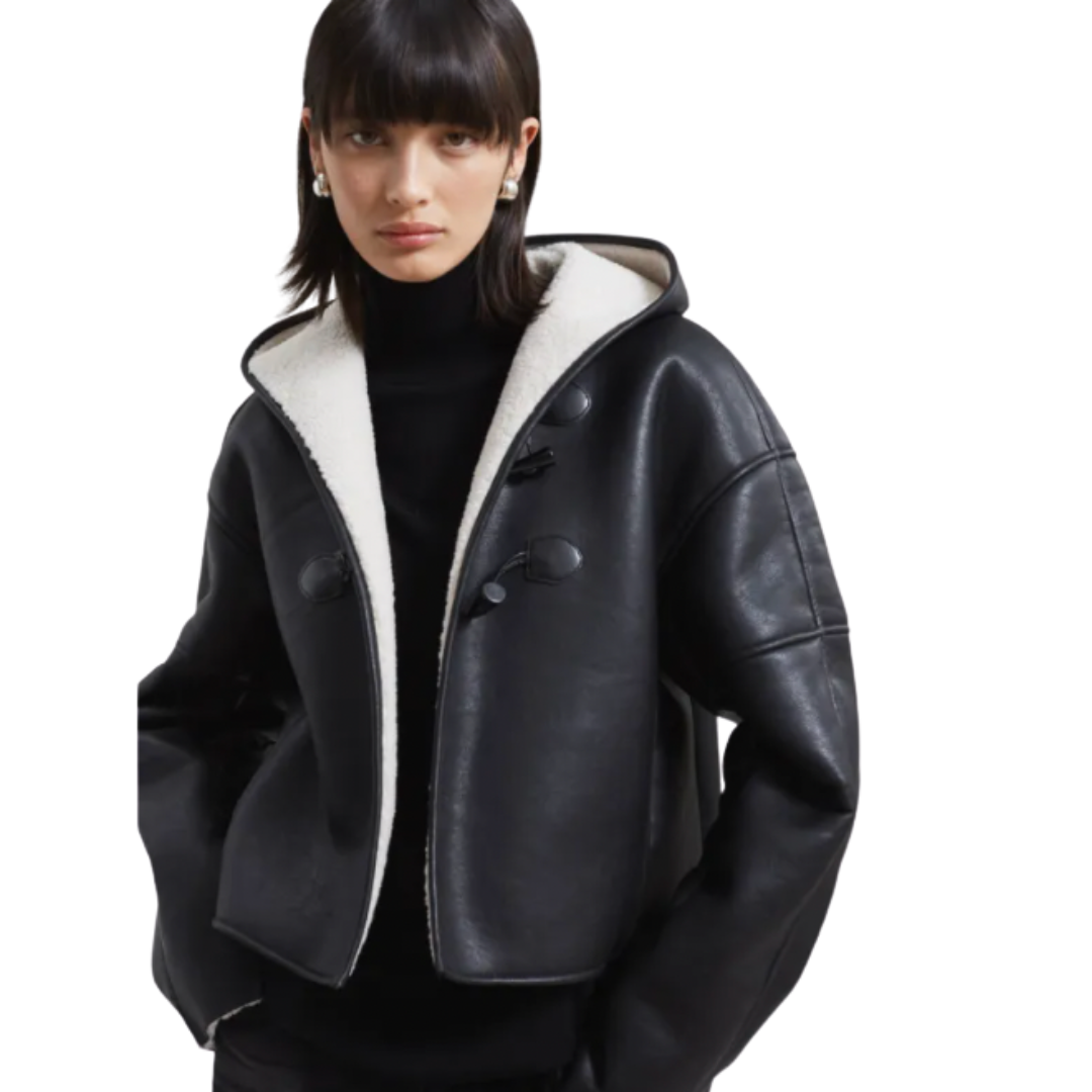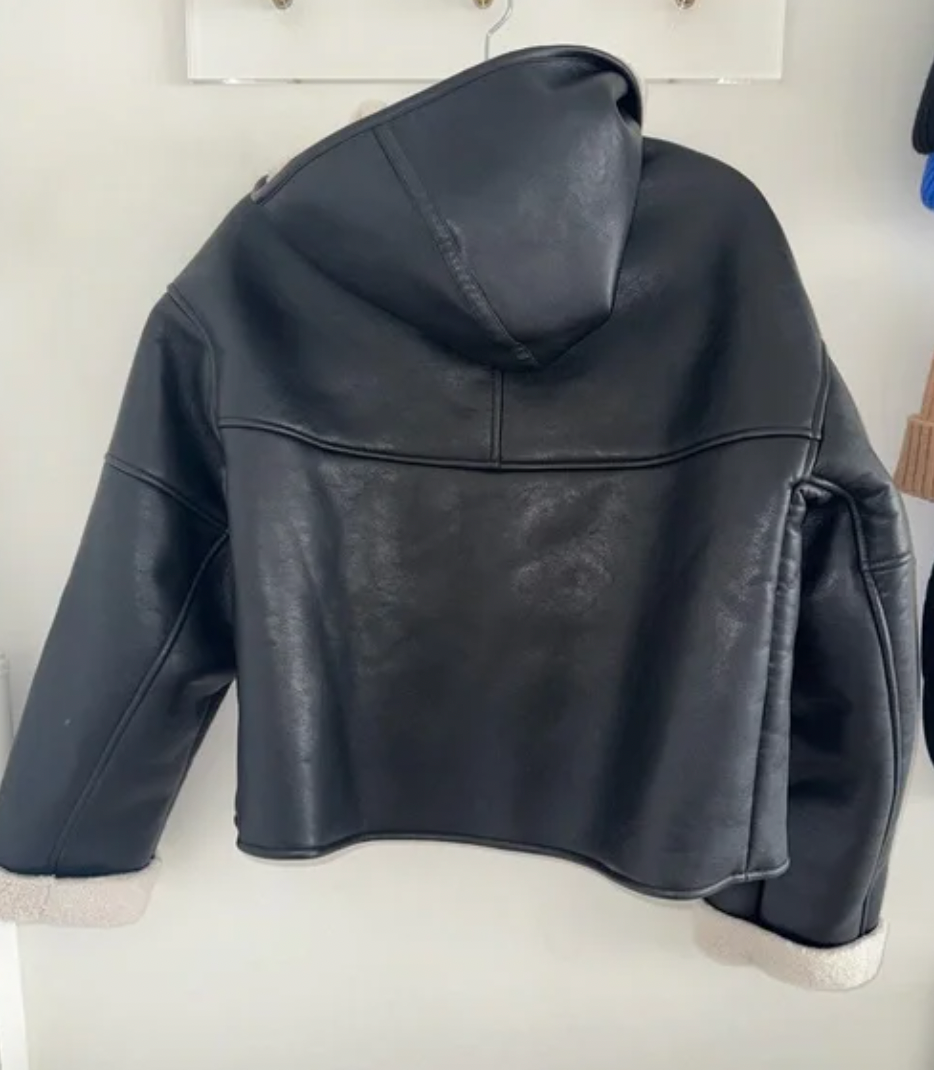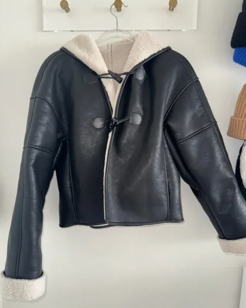 This stylish jacket features a sleek black faux leather exterior complemented by soft shearling lining, ensuring both warmth and sophistication.