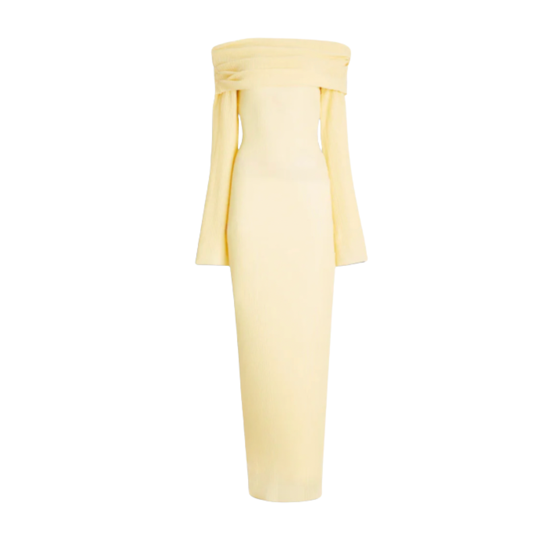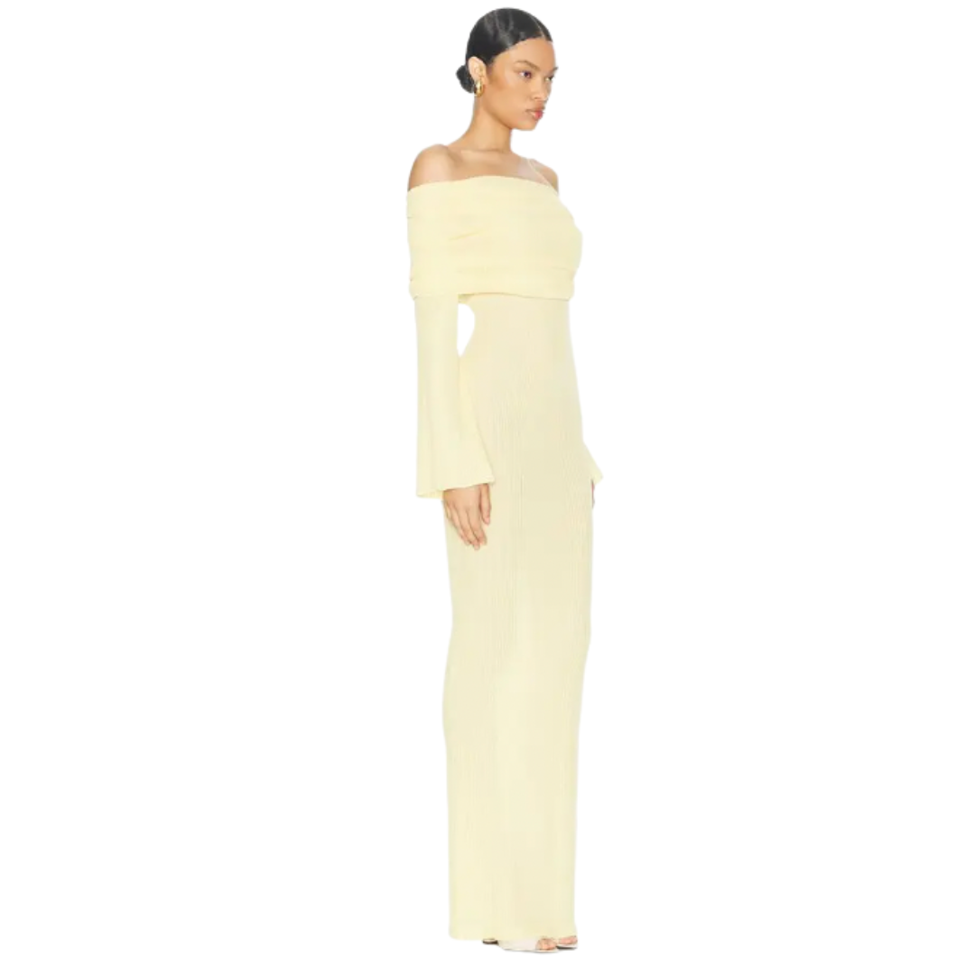 Knit, off-the-shoulder maxi dress with fold over neckline and long, bell sleeves. Shown here in Butter.