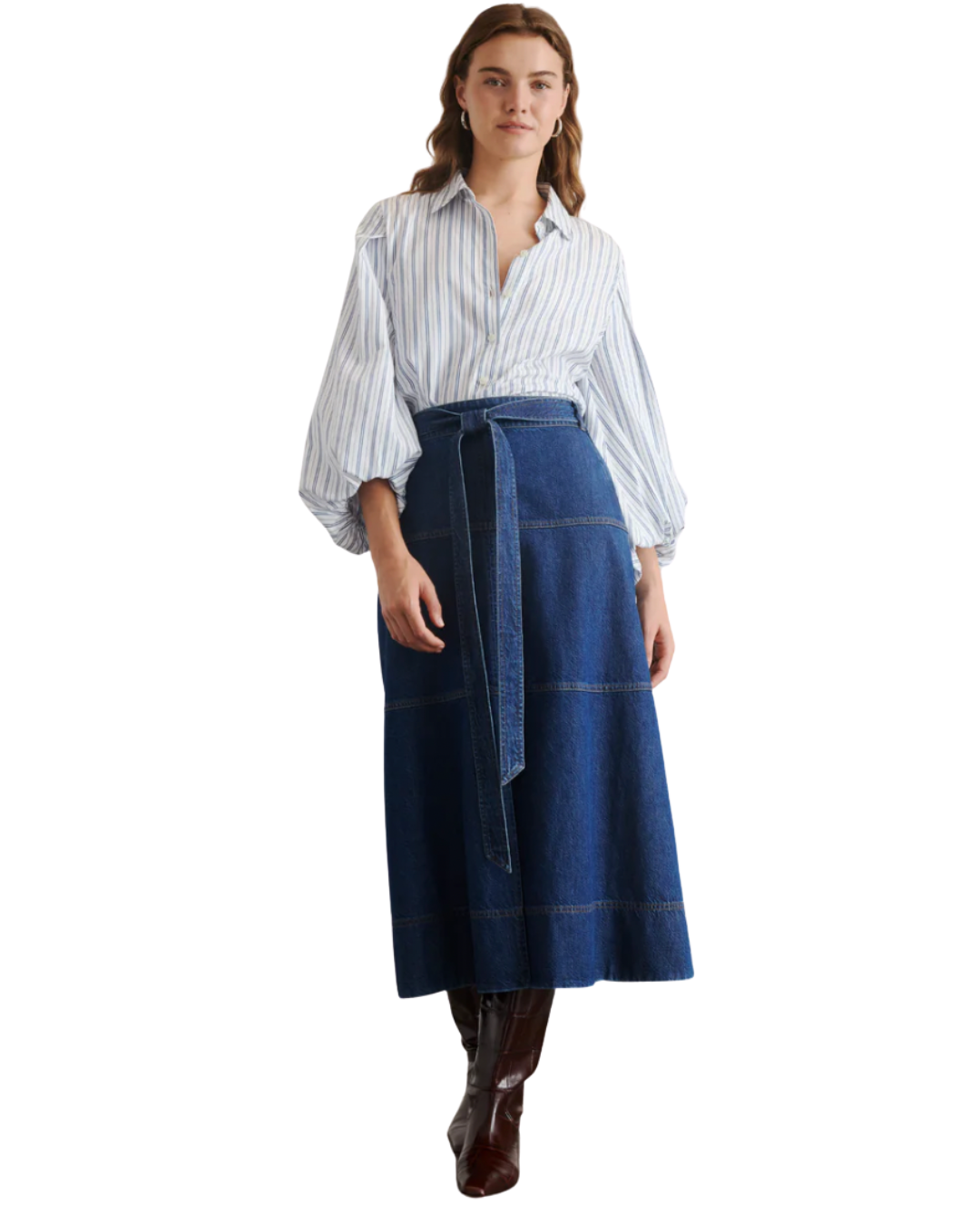 Featuring tiered seaming throughout a slimmer A-line shape and a self-tie belt for added interest, Hudley is a high-waisted silhouette with the perfect proportions in mind.