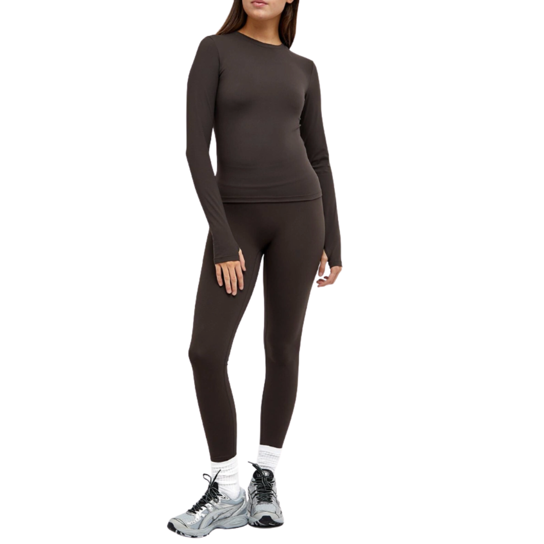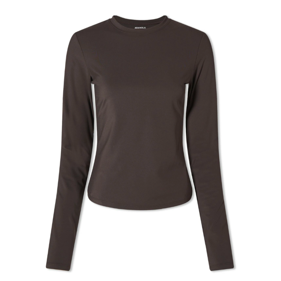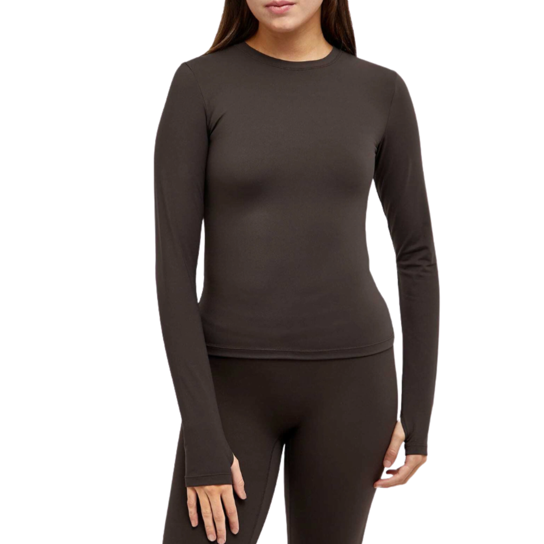 70% Nylon, 30% Elastane, Compressive Active Fit, Smoothing & Sculpting Fabric, 4-Way Stretch, Thumb Holes, Printed Branding, Machine Wash Cool. Adanola Women's Long Sleeve Longline Top in Coffee Bean