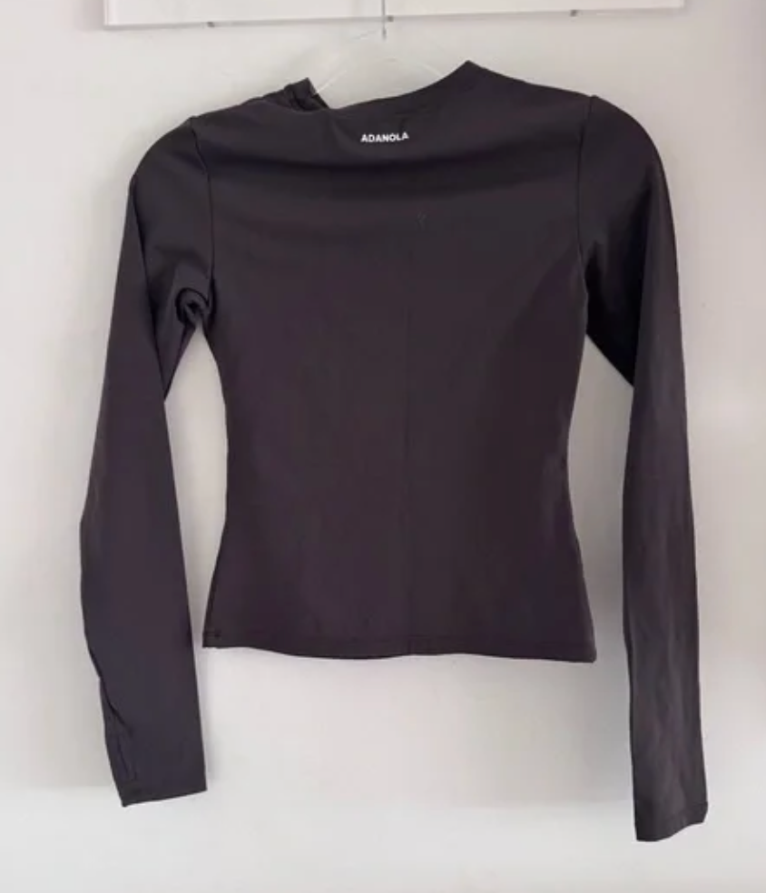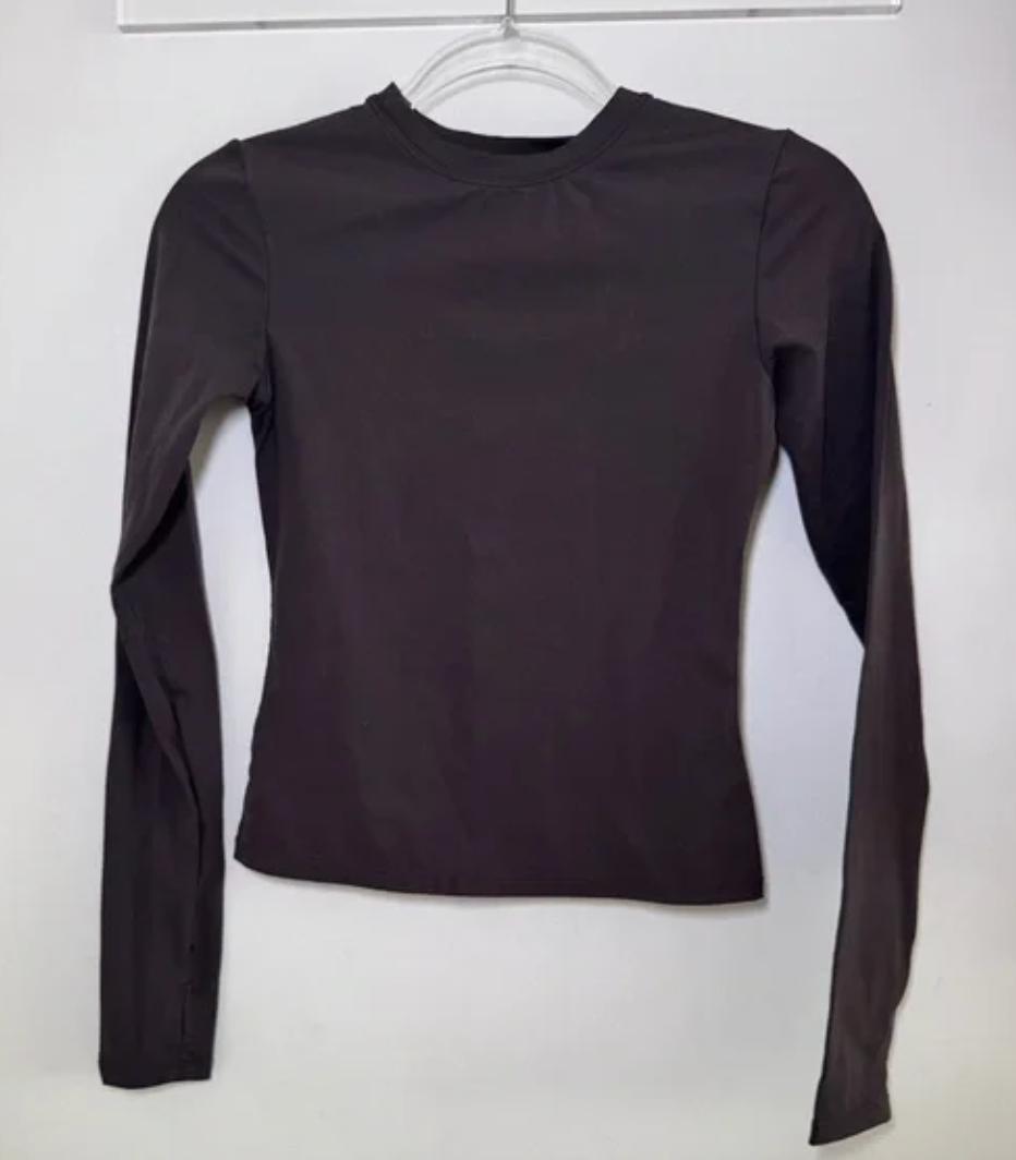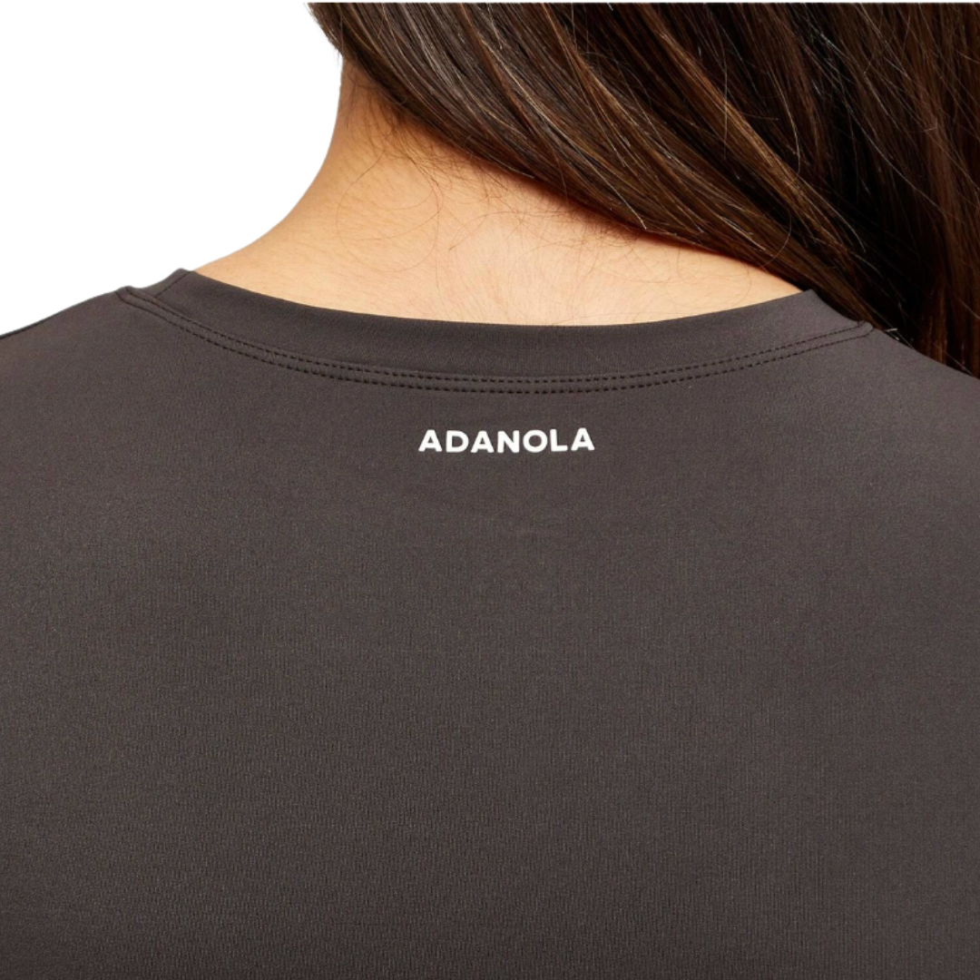 70% Nylon, 30% Elastane, Compressive Active Fit, Smoothing & Sculpting Fabric, 4-Way Stretch, Thumb Holes, Printed Branding, Machine Wash Cool. Adanola Women's Long Sleeve Longline Top in Coffee Bean