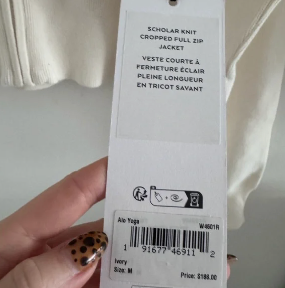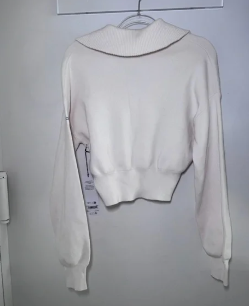 - True to size—designed for a cropped silhouette with a closer fit at the ribbed-knit hem