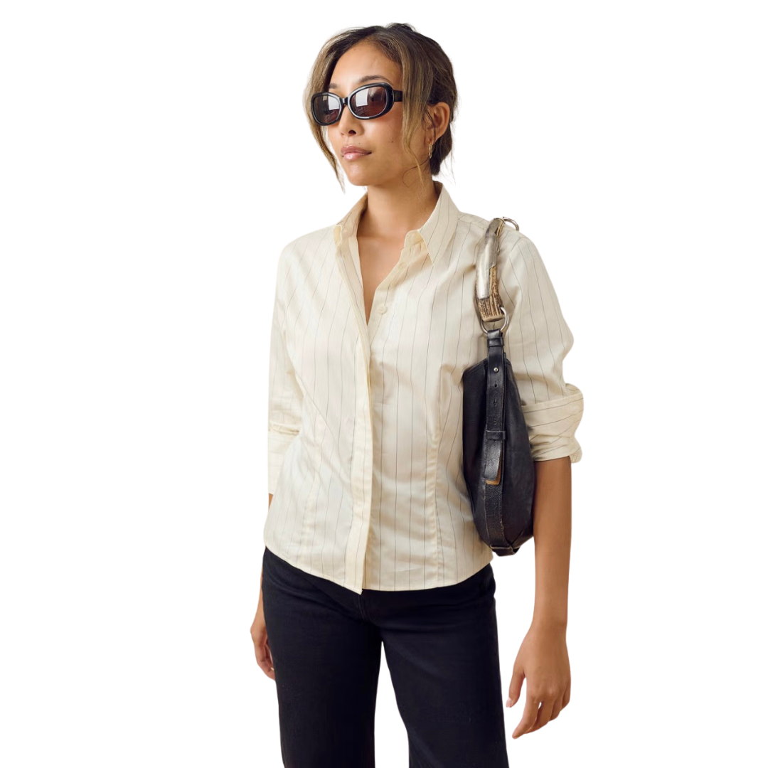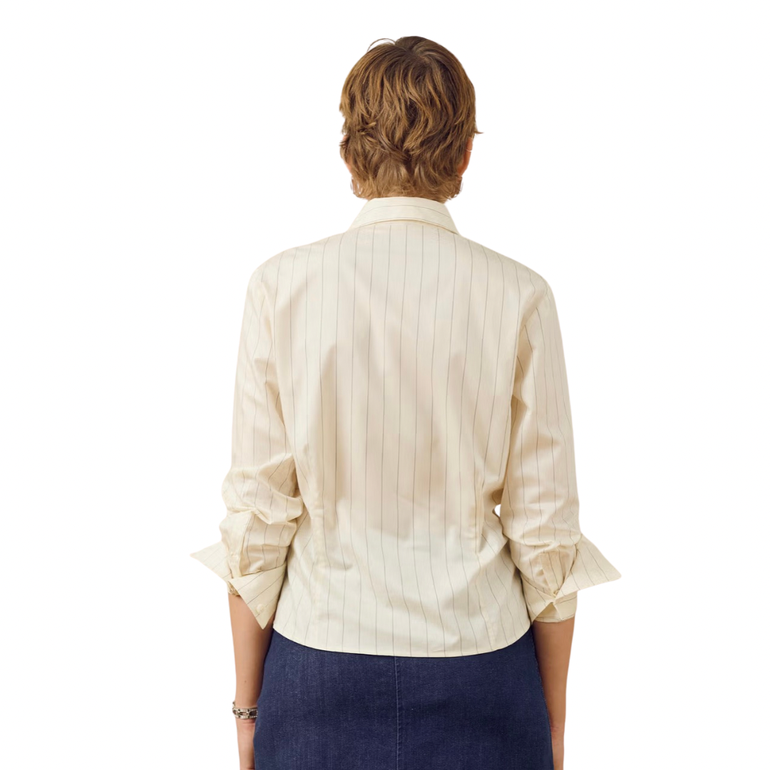 This fitted cotton poplin shirt features a shorter cut for a sharp look. Designed with a neat collar, corozo button front, and subtle darts in the back, it creates a flattering shape while keeping a classic feel. Wear it buttoned up for a polished style or leave the cuffs undone for a relaxed touch. Perfect with jeans, tailored pants, or skirts.