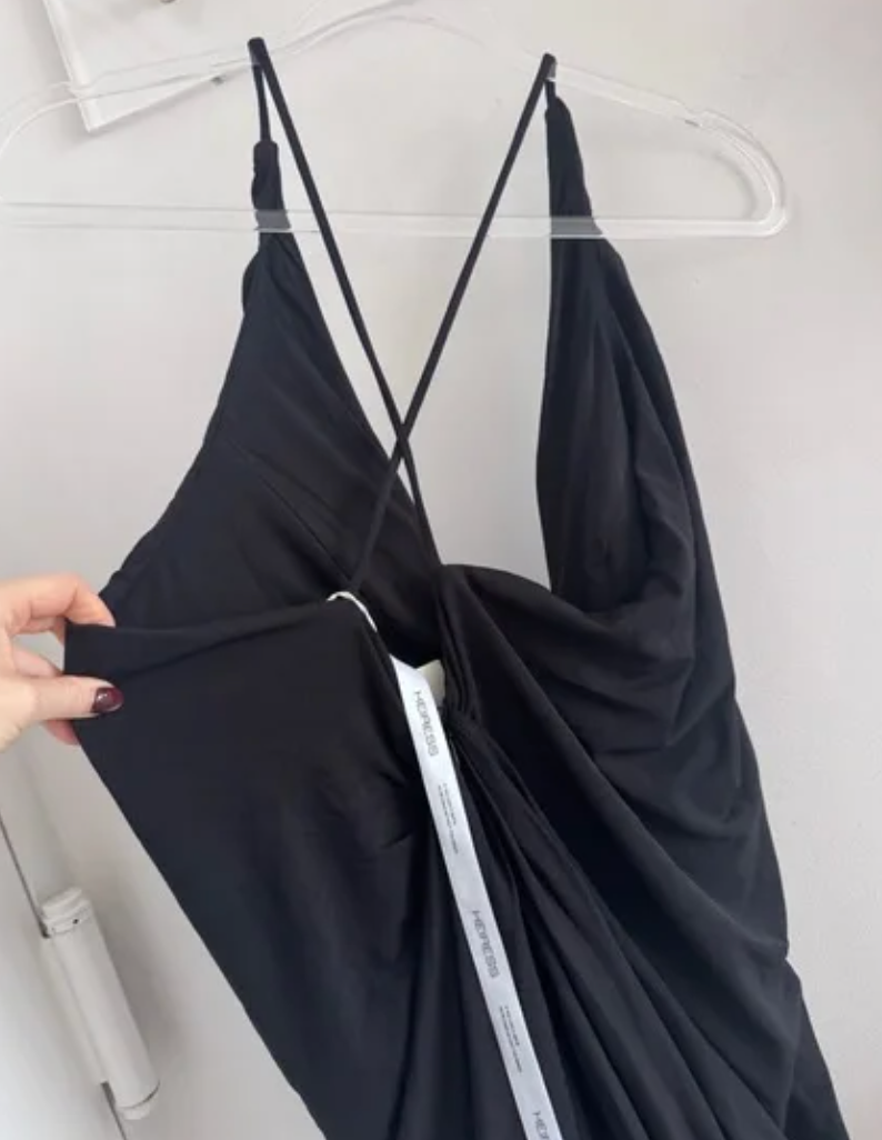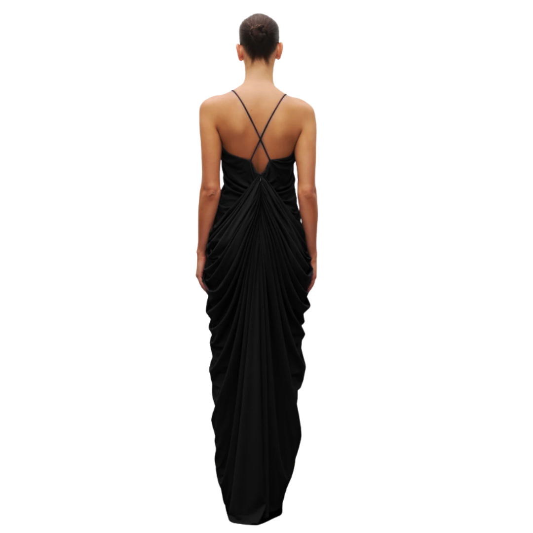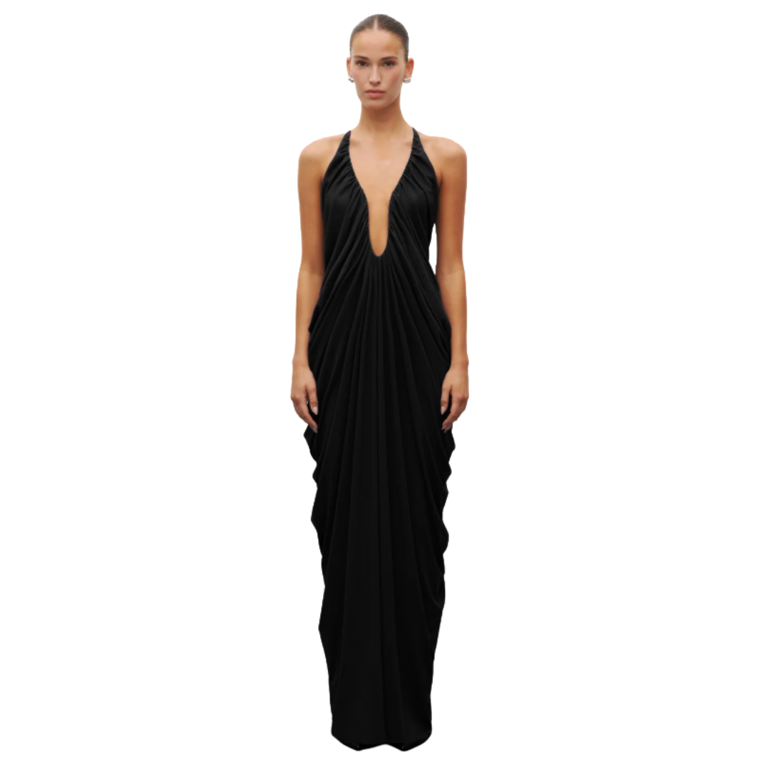 Cut from Heiress’ signature stretch crepe, this gown drapes effortlessly along the body, creating fluid movement and sculpted lines. A wired plunging neckline enhances the bust while the gathered bodice elongates the silhouette. Elegant, structured, and undeniably striking.