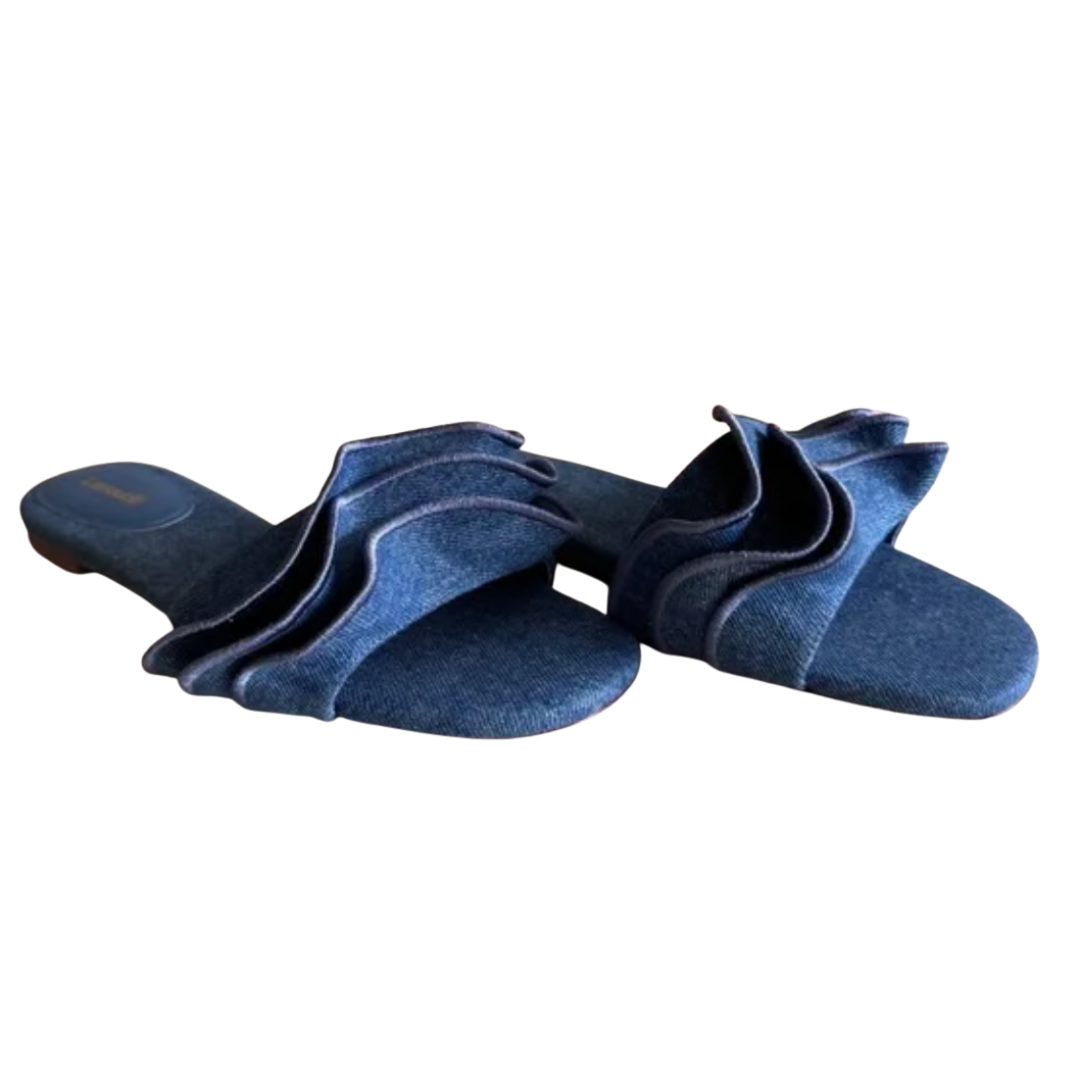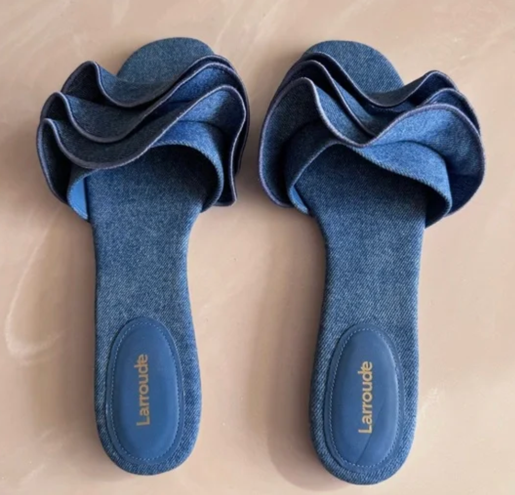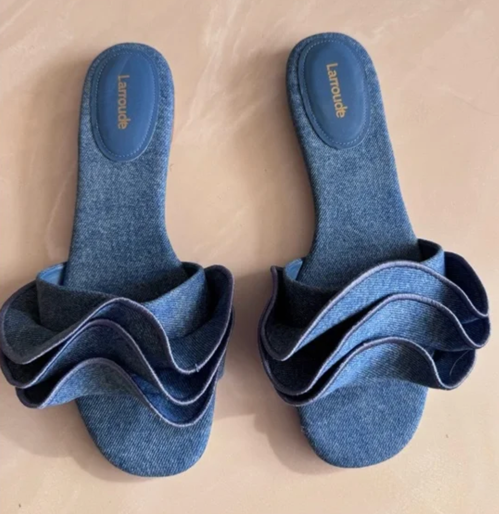 Larroudé blue denim-like slip on flat sandal with a ruffle top detail and rounded toe