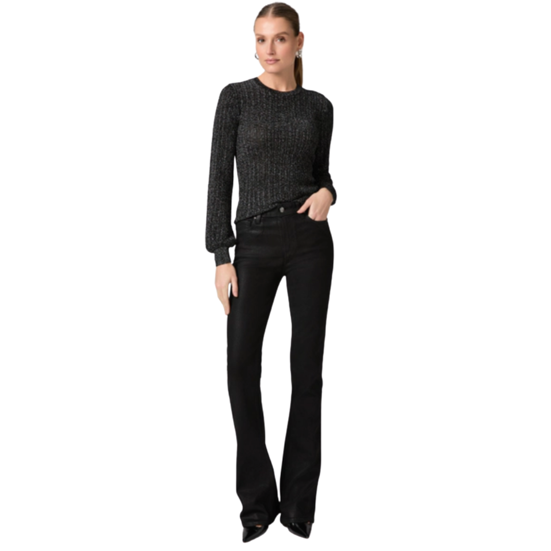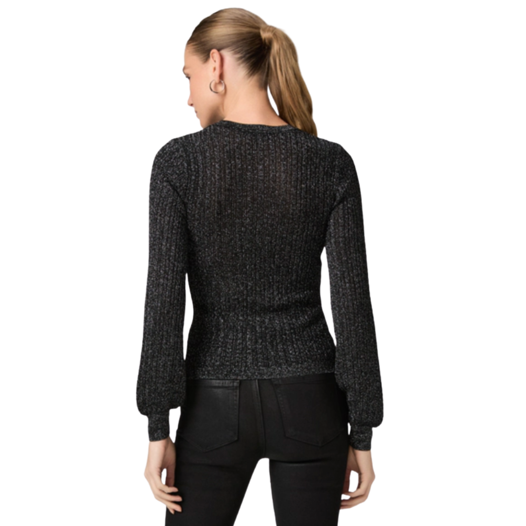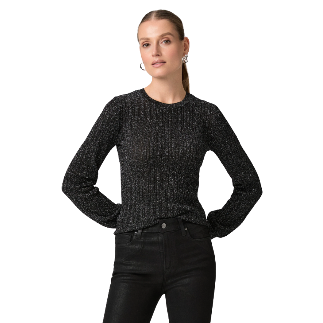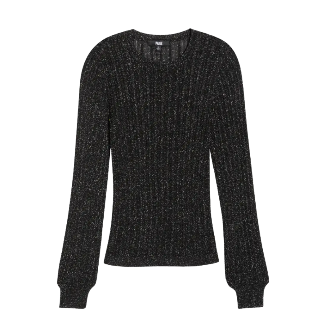 Add a touch of shimmer to your wardrobe with the Adela Sweater. Crafted from a black slinky sparkle yarn, this style is designed with a mini cable rib stitch, a classic crew neckline, and a flattering fit that's perfect for tucking into denim or skirts.