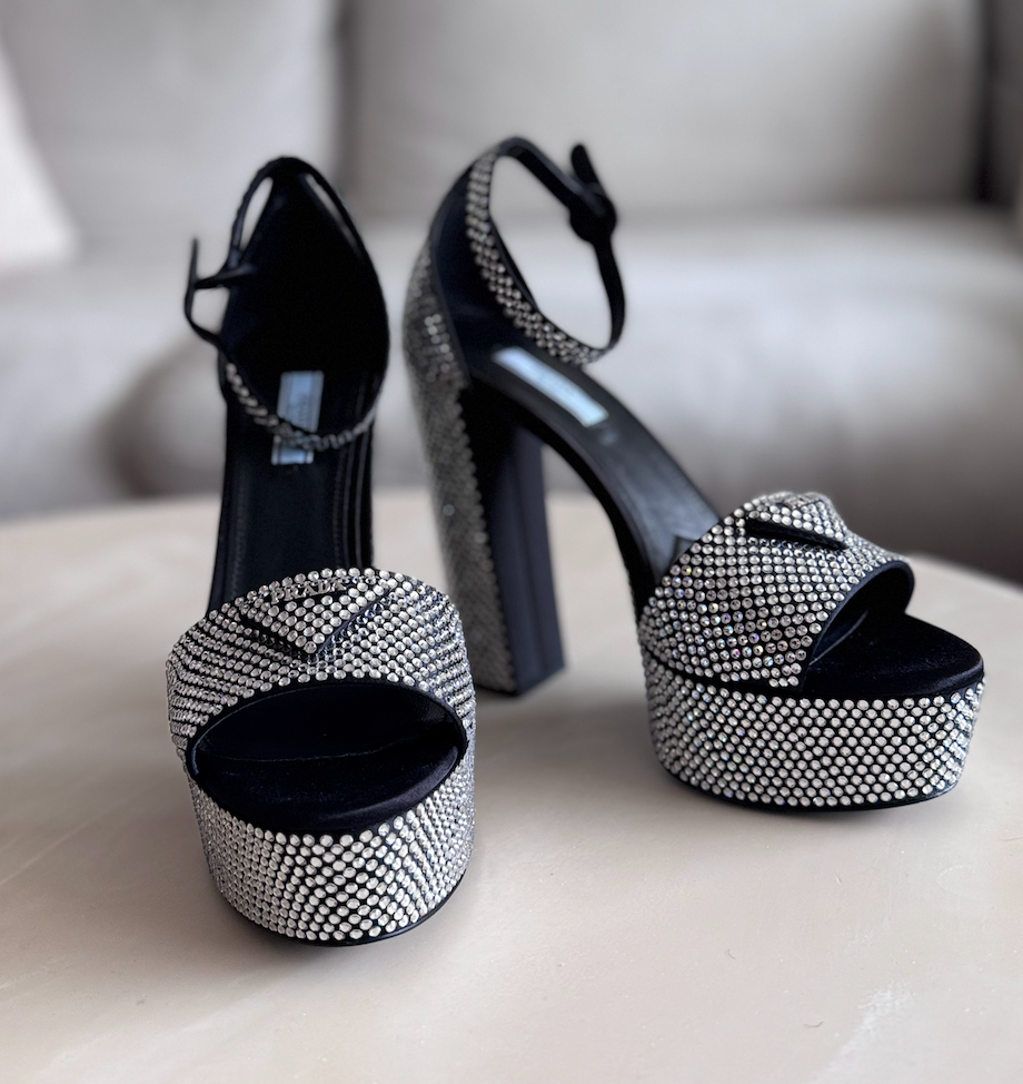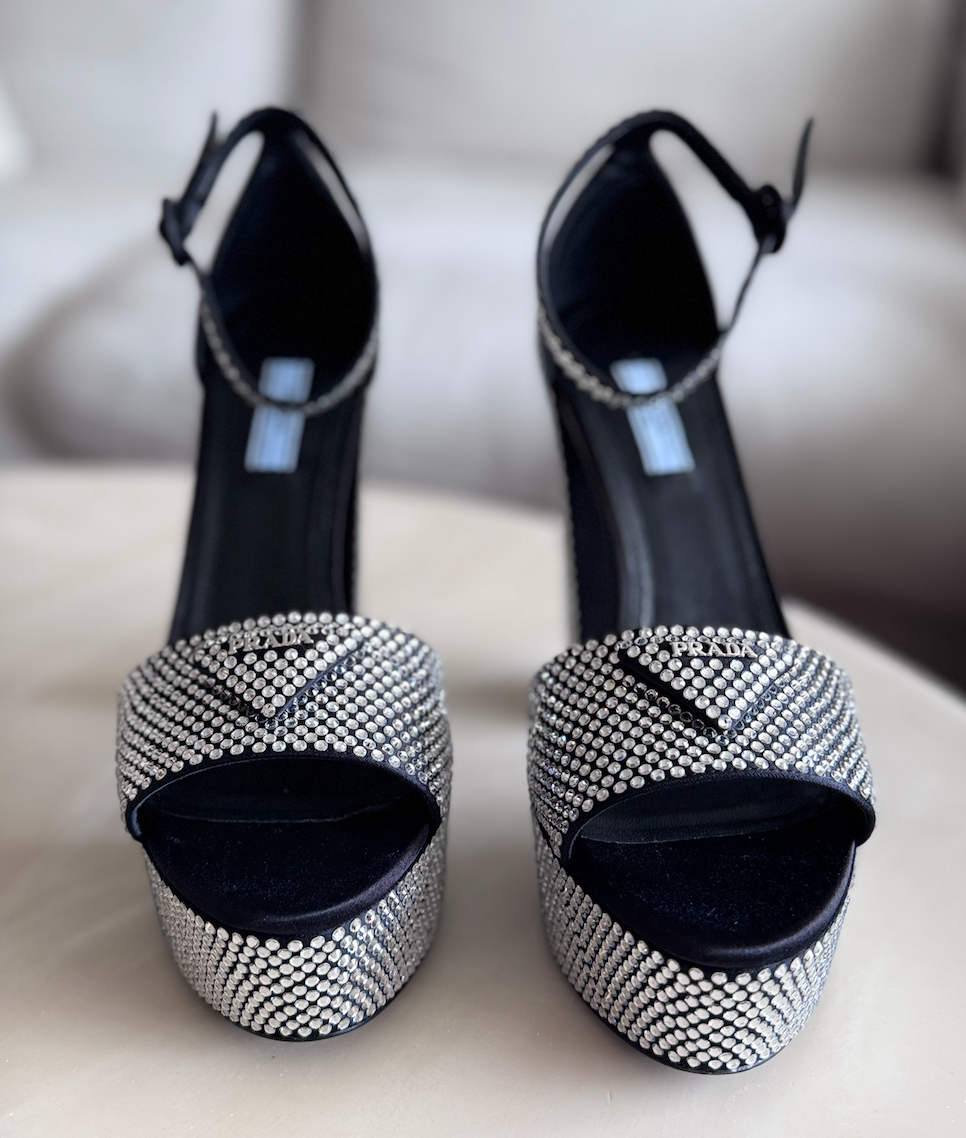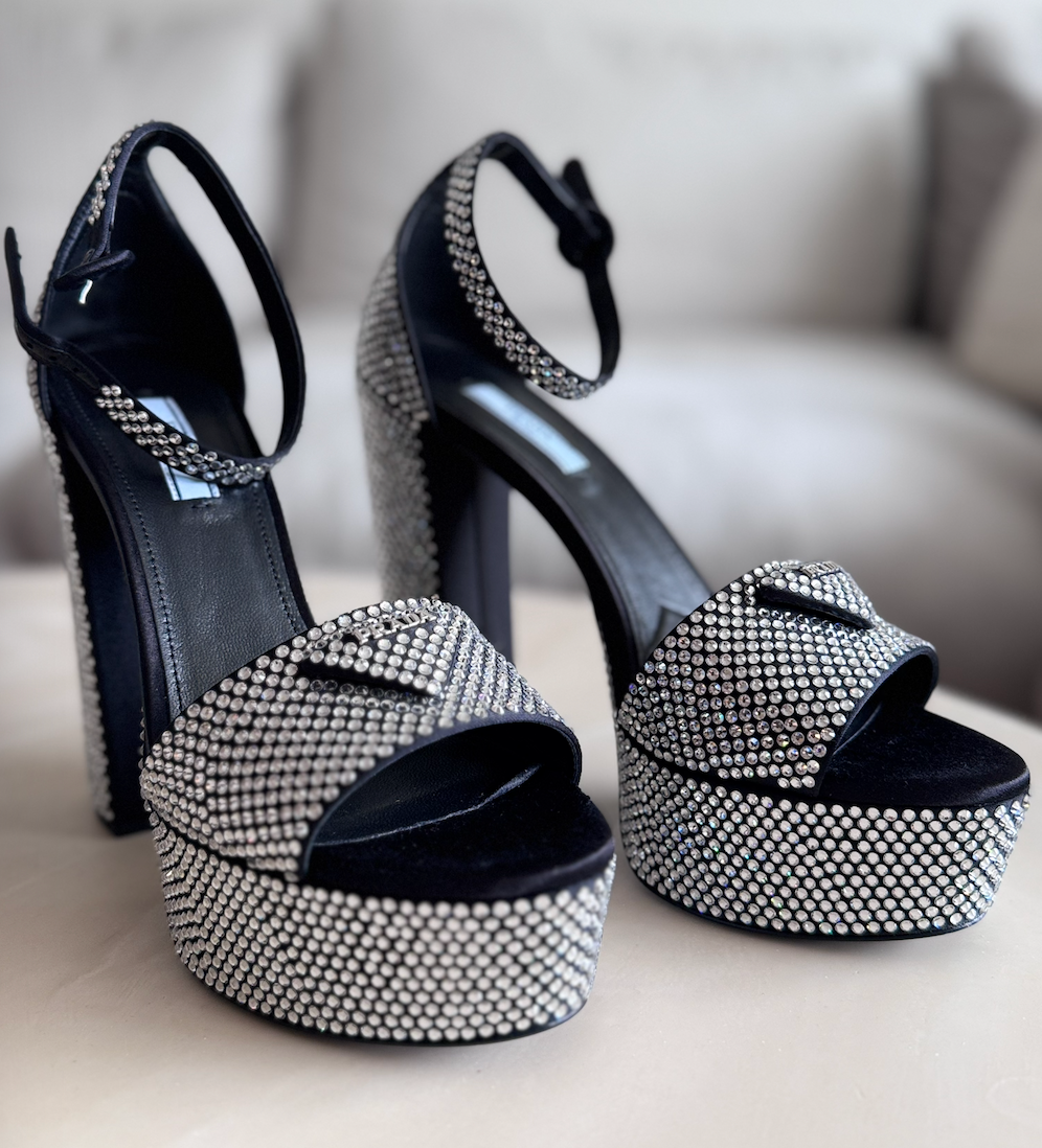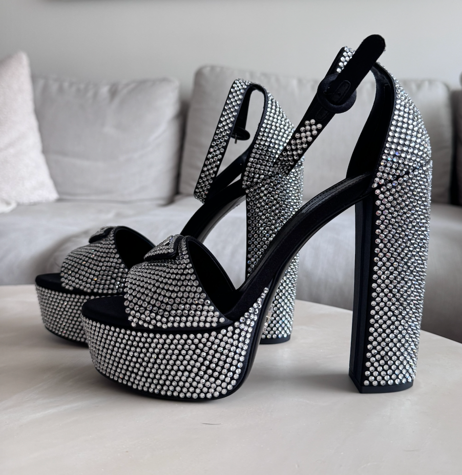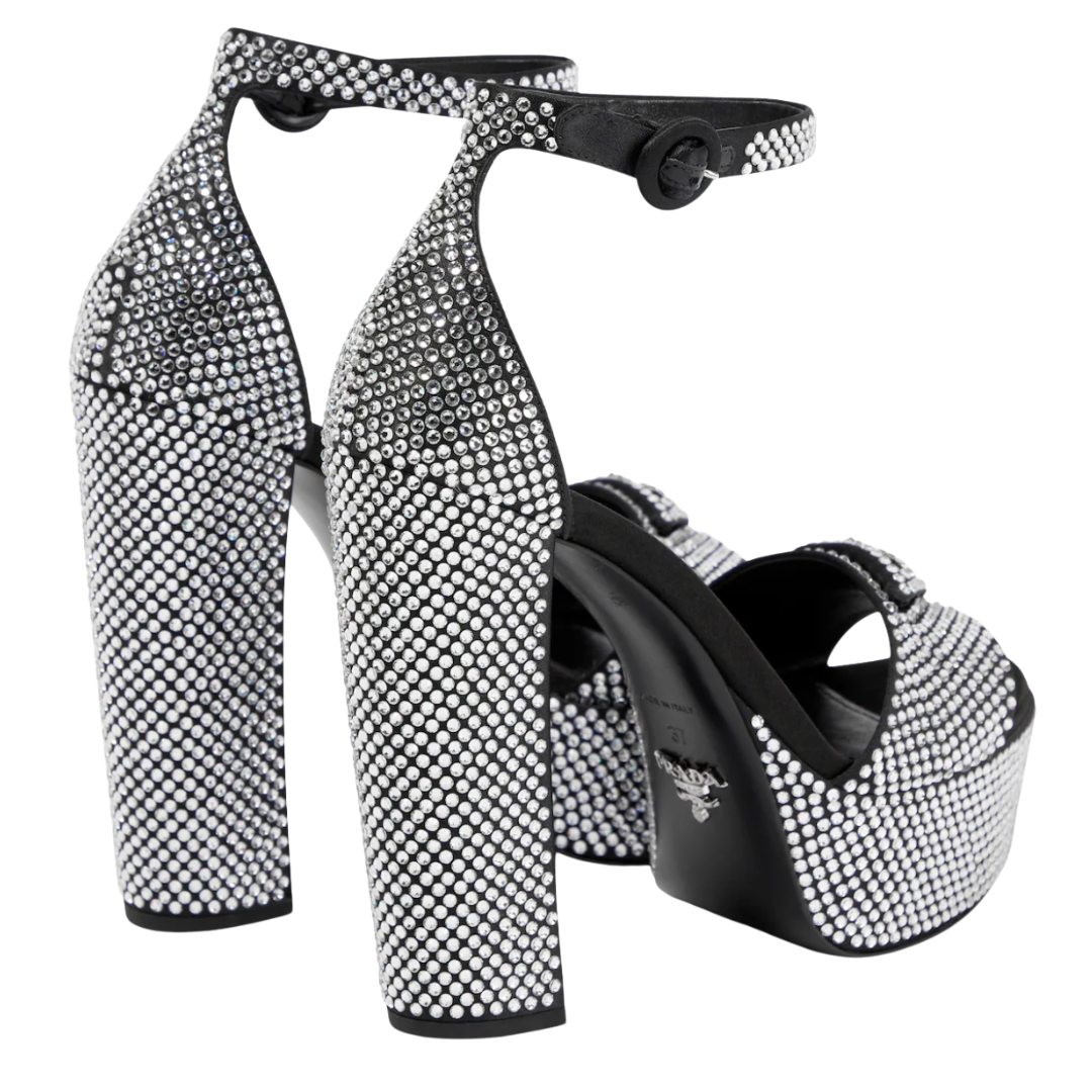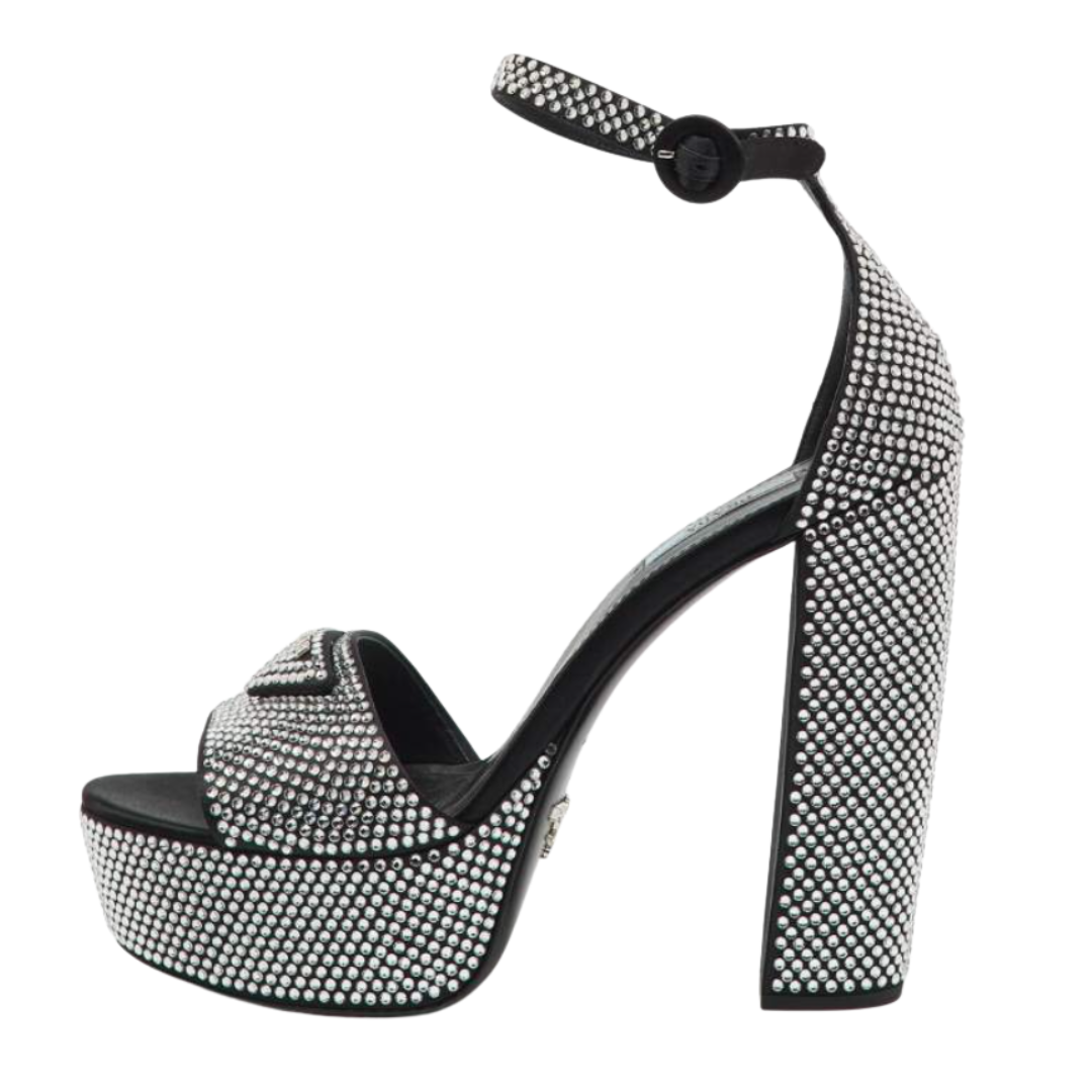 Prada Crystal Embellished Satin Platform Sandals, 39